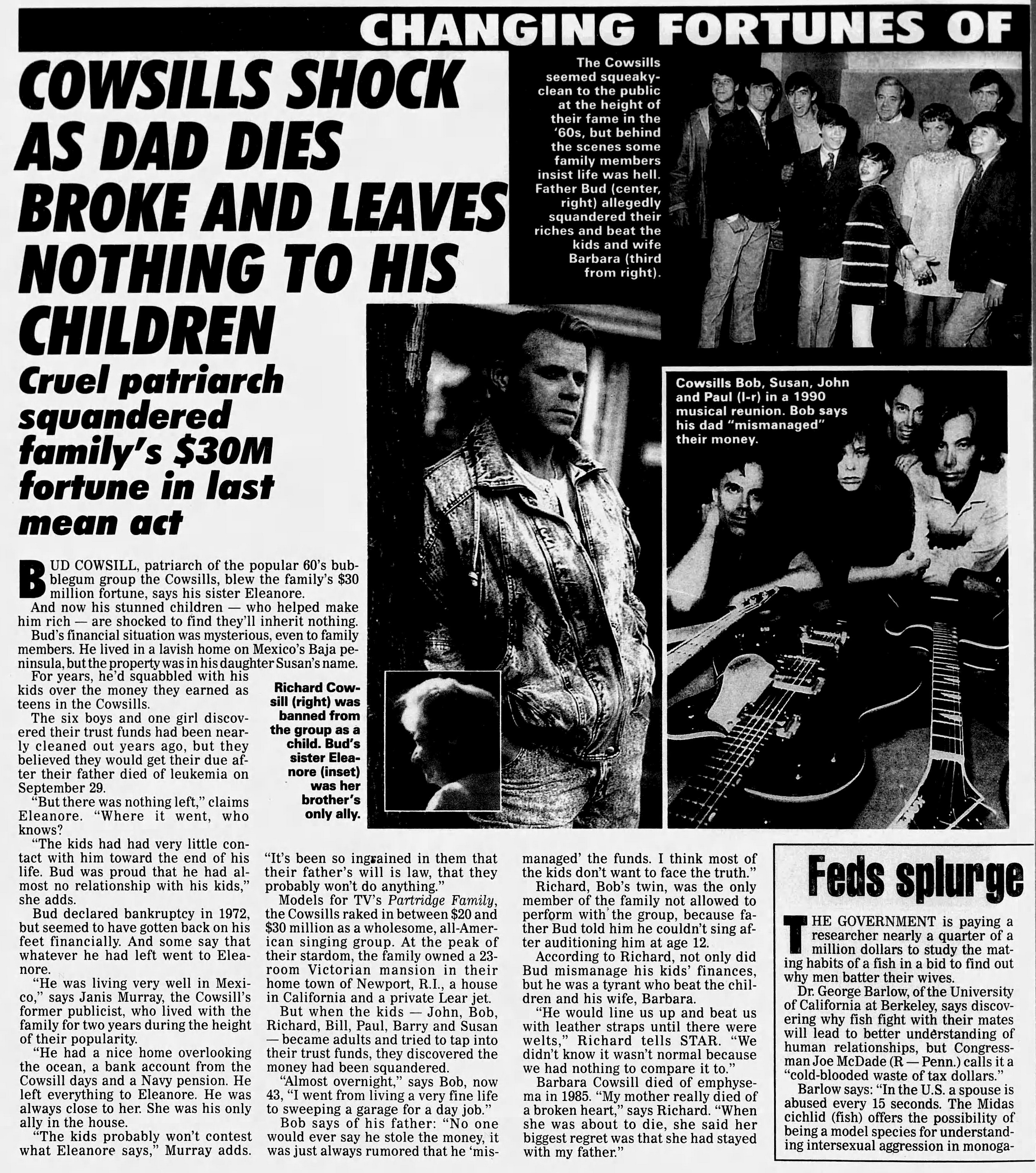 Cowsills Shock As Dad Dies Broke and Leaves Nothing To His Children December 6, 1992 San Antonio Express NewsSan Antonio, Texas
