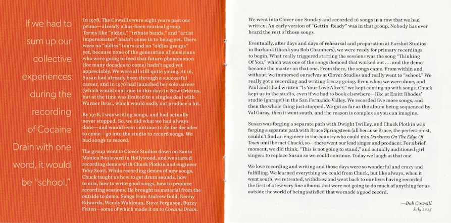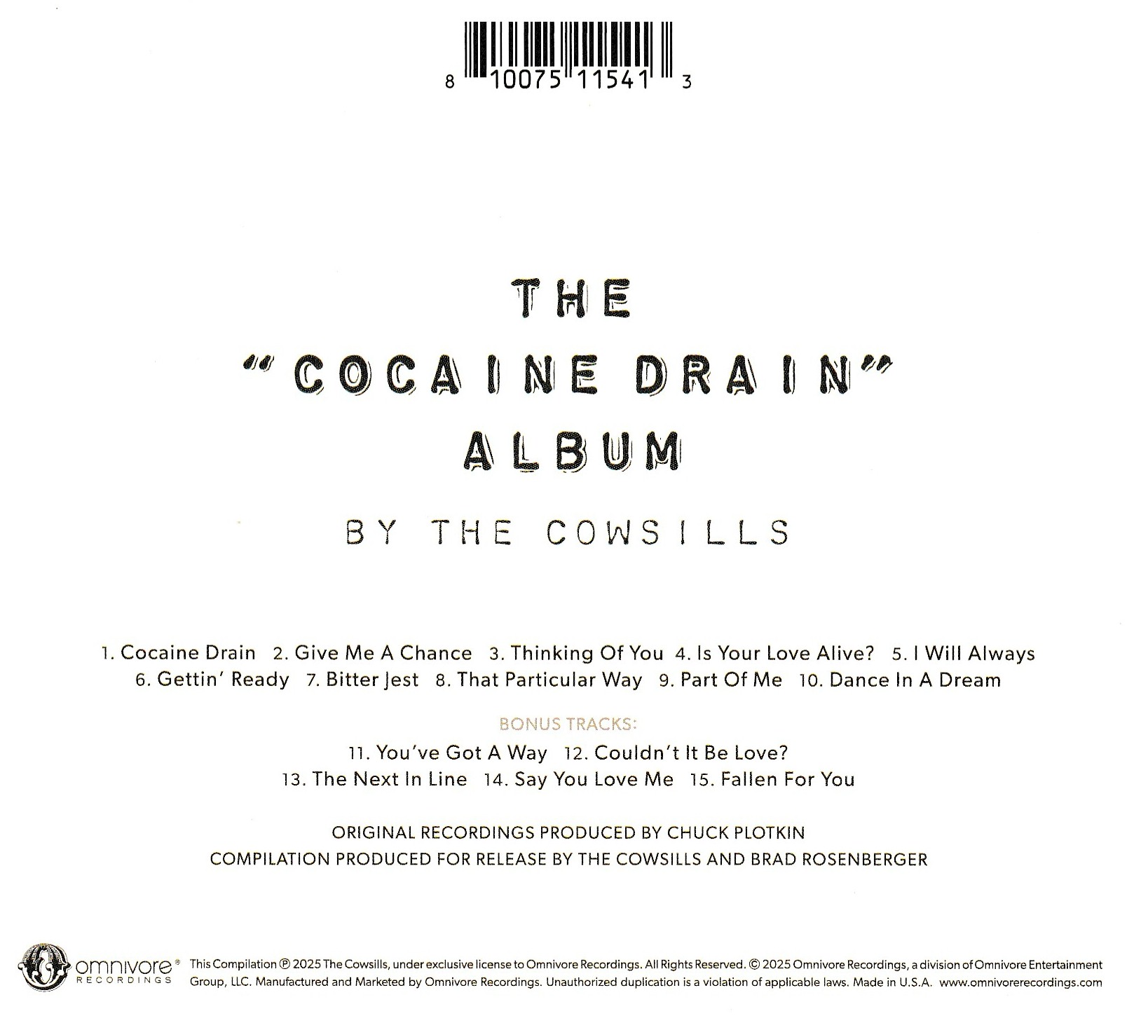 As for Cocaine Drain, it can't be a great feeling to know you've done something special and that the world won't get to hear it, at least until the internet and specialty record labels are invented. "It's the first time I really experienced rejection on a level of, 'Okay, I was wrong about that,' " Bob admits. "But we had things aligning in front of us until it all fell apart. We made a great record, we had a great producer, and there was that clan of musicians around us that we liked. But it's our history: When things fall apart we recoil and we go back to our lives until the next thing comes up. We didn't think that someday there would be oldies tours [like the Happy Together tour where The Cowsills are a beloved fixture] that would keep people like us on the road for decades. Who knew?"