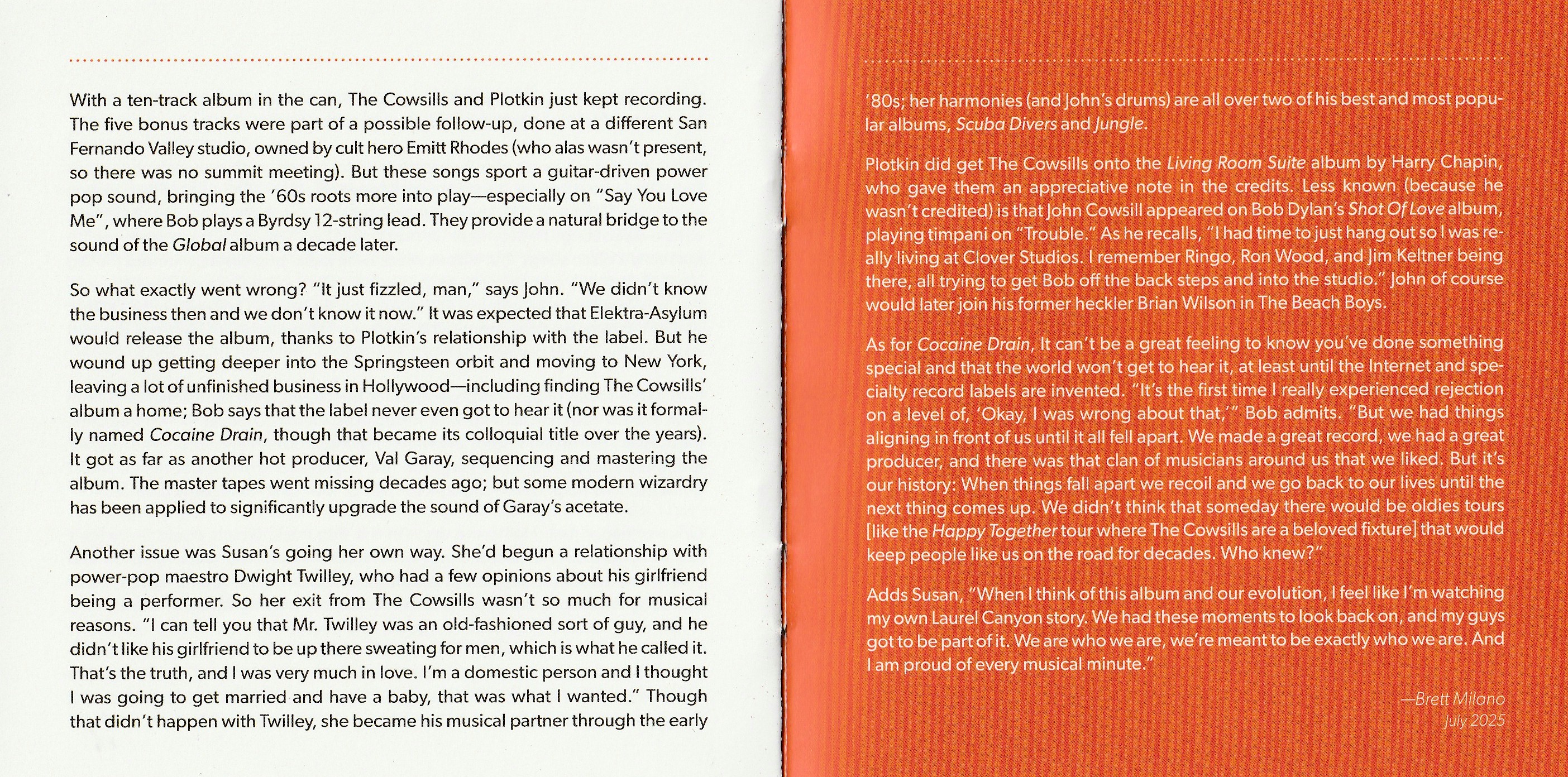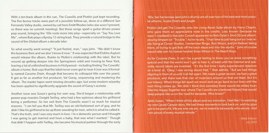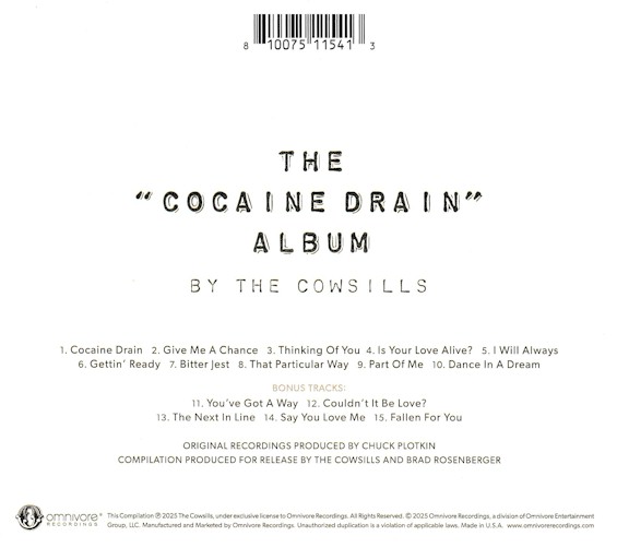 So what exactly went wrong? "It just fizzled, man," says John. "We didn't know the business then and we don't know it now." It was expected that Elektra-Asylum would release the album, thanks to Plotkin's relatioship with the label. But he wound up getting deeper into the Springsteen orbit and moving to New York, leaving a lot of unfinished business in Hollywood - including finding The Cowsills' album a home; Bob says that the label never even got to hear it (nor was it formally named Cocaine Drain, though that became its colloquial title over the years). It got as far as another hot producer, Val Garay, sequencing and mastering the album. The master tapes went missing decades ago; but some modern wizardry has been applied to significantly upgrade the sound of Garay's acetate.