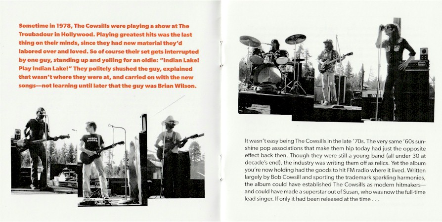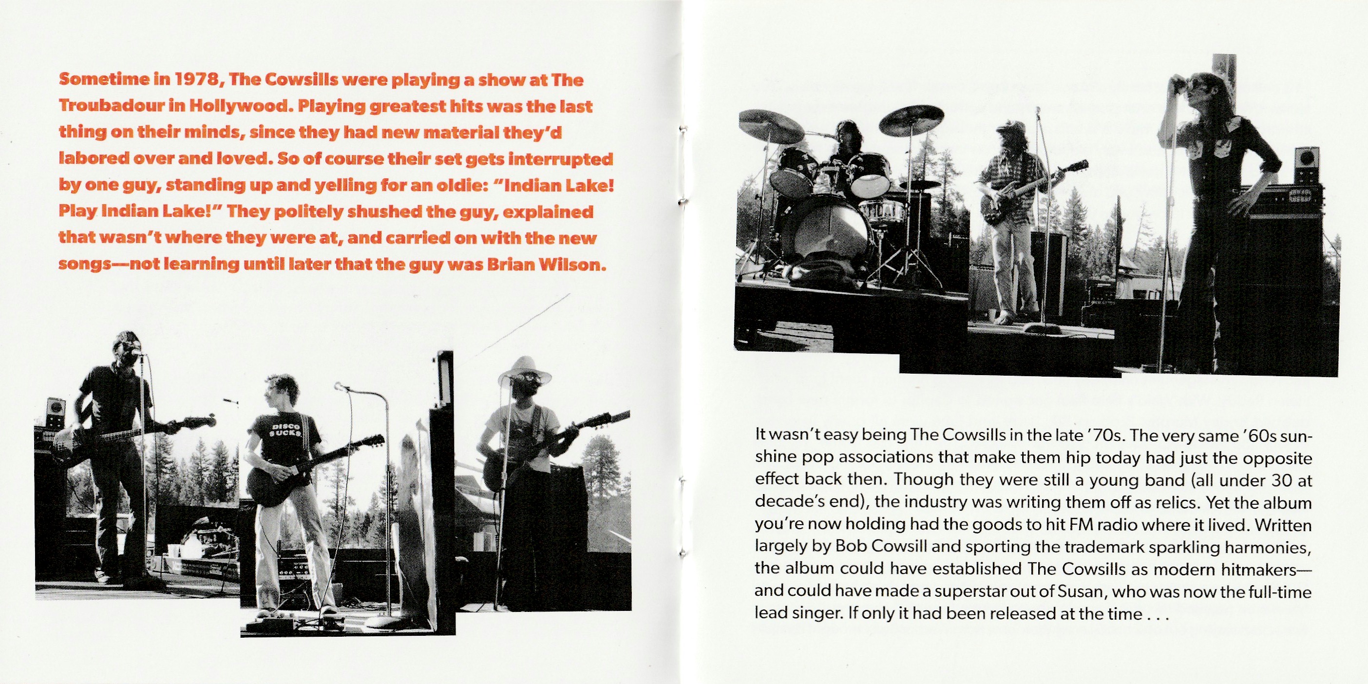 Sometime in 1978, The Cowsills were playing a show at The Troubadour in Hollywood. Playing greatest hits was the last thing on their minds, since they had new material they'd labored over and loved. So of course their set gets interrrupted by one guy, standing up and yelling for an oldie: "Indian Lake! Play Indian Lake!" They politely shushed the guy, explained that wasn't where they were at, and carried on with the new songs - not learning until later that the guy was Brian Wilson.