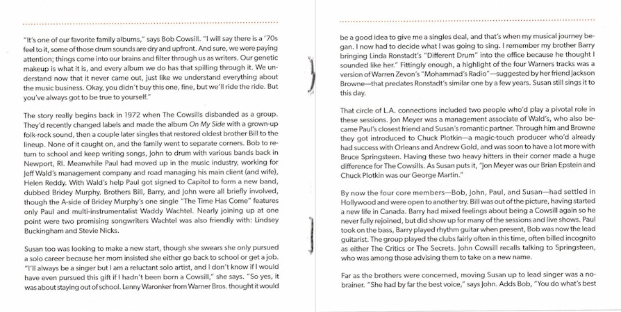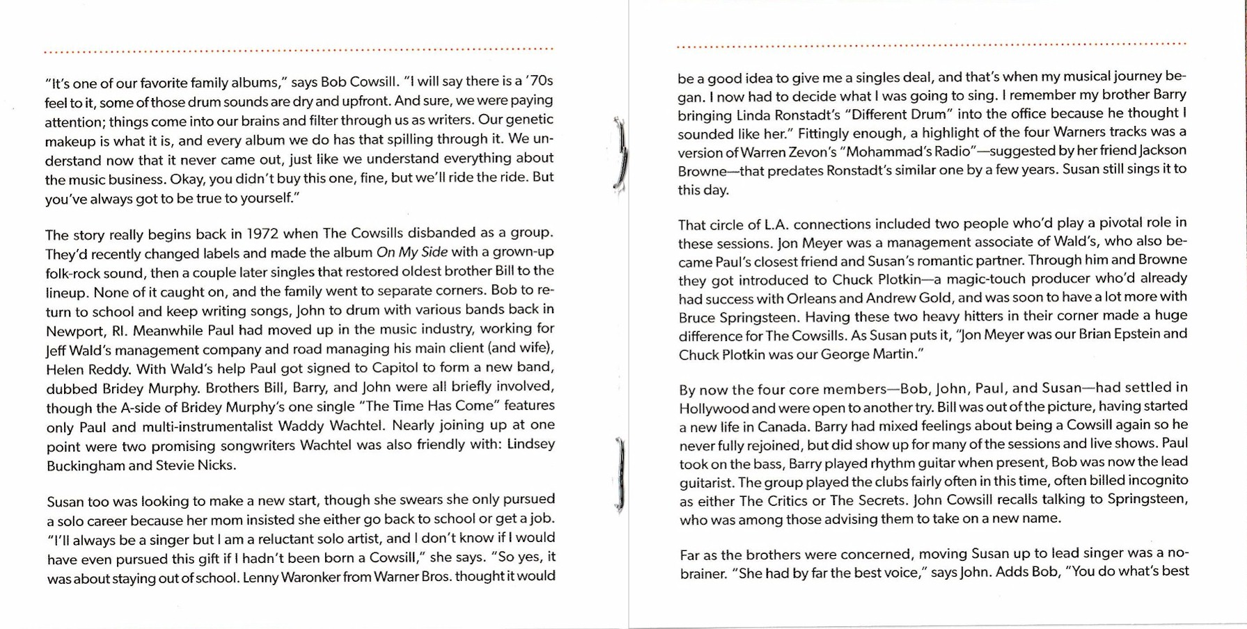 "It's one of our favorite family albums," says Bob Cowsill. "I will say there is a '70s feel to it, some of those drum sounds are dry and upfront. And sure, we were paying attention; things come into our brains and filter through us as writers. Our genetic makeup is what it is, and every album we do has that spilling through it. We understand now that it never came out, just like we understand everything about the music business. Okay, you didn't buy this one, fine, but we'll ride the ride. But you've always got to be true to yourself."