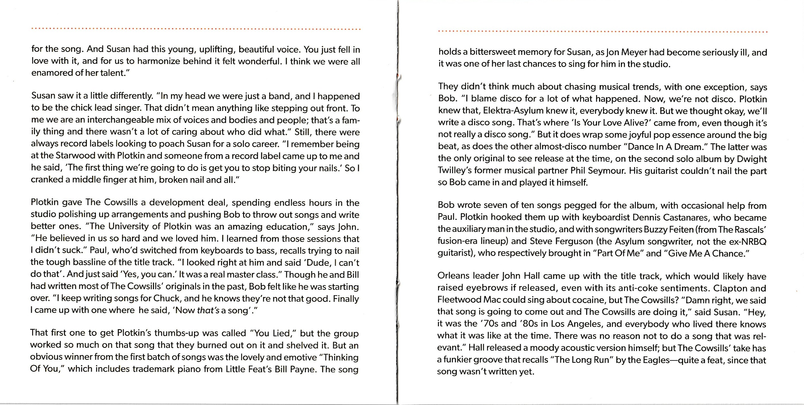 It wasn't easy being The Cowsills in the late '70s. The very same '60s sunshine pop associations that make them hip today had just the opposite effect back then. Though they were still a young band (all under 30 at decade's end), the industry was writing them off as relics. Yet the album you're now holding had the goods to hit FM radio where it lived. Written largely by Bob Cowsill and sporting the trademark sparkling harmonies, the album could have established The Cowsills as modern hitmakes - and could have made a superstar out of Susan, who was now the full-time lead singer. If only it had been released at the time . . .