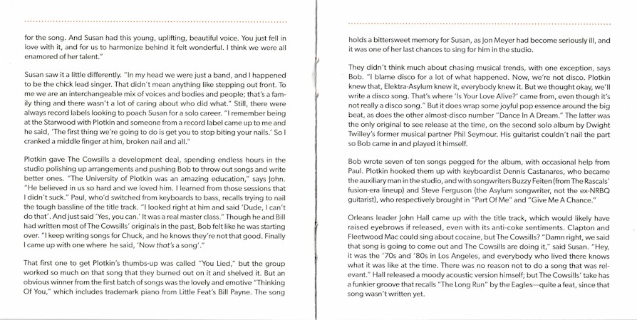 That circle of L.A. connections included two people who'd play a pivotal role in these sessions. Jon Meyer was a management associate of Wald's, who also became Paul's closet friend and Susan's romantic partner. Through him and Browne they got introduced to Chuck Plotkin - a magic-touch producer who'd already had success with Orleans and Andrew Gold, and was soon to have a lot more with Bruce Springsteen. Having these two heavy hitters in their corner made a huge difference for The Cowsills. As Susan puts it, "Jon Meyer was our Brian Epstein and Chuck Plotkin was our George Martin."