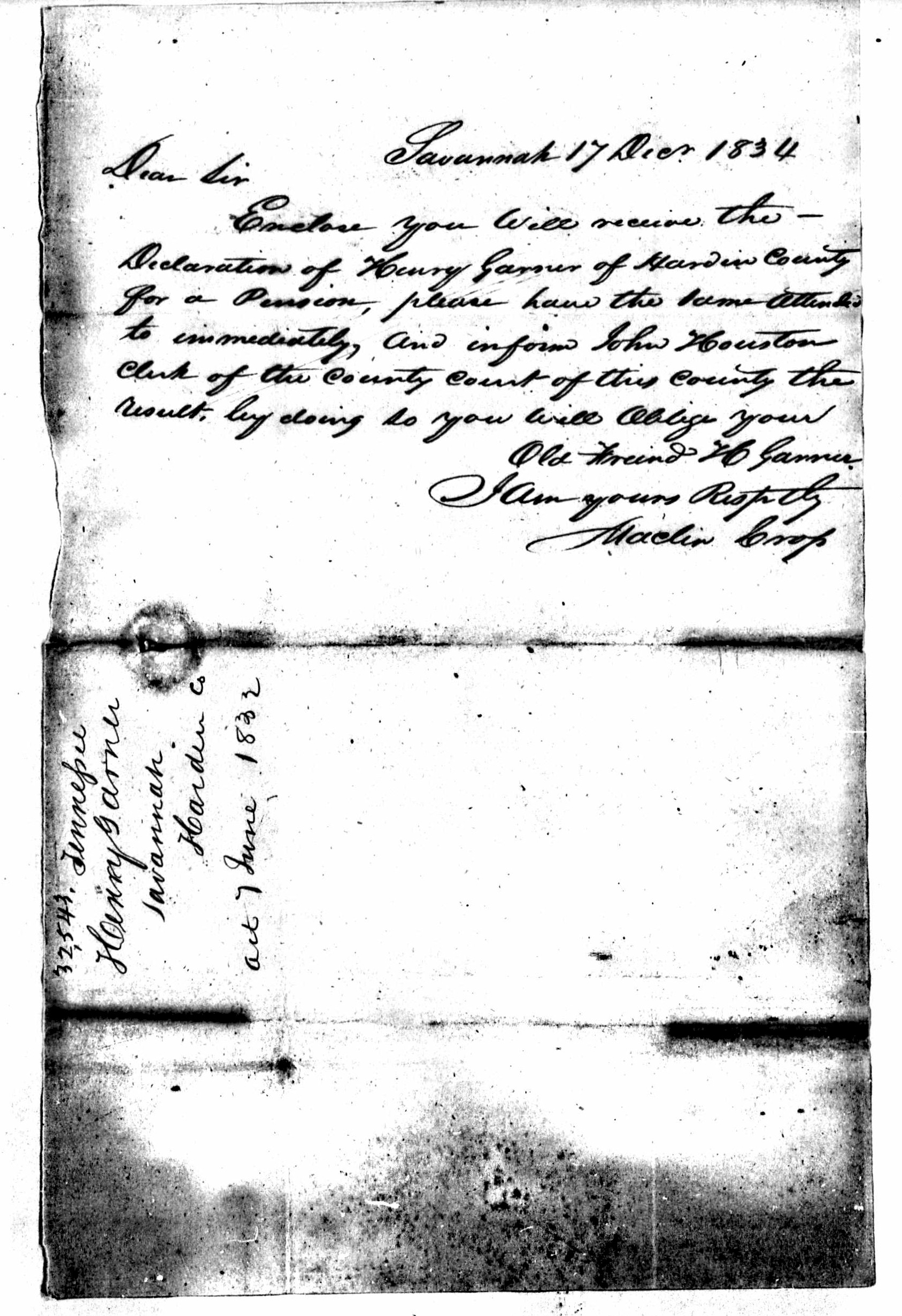 Enclosed you will receive the Declaration of Henry Garner of Hardin County for a pension, please have the same attended to immediately and inform john Houston Clerk of the County Court of this county the result by doing so you will obli(??) your