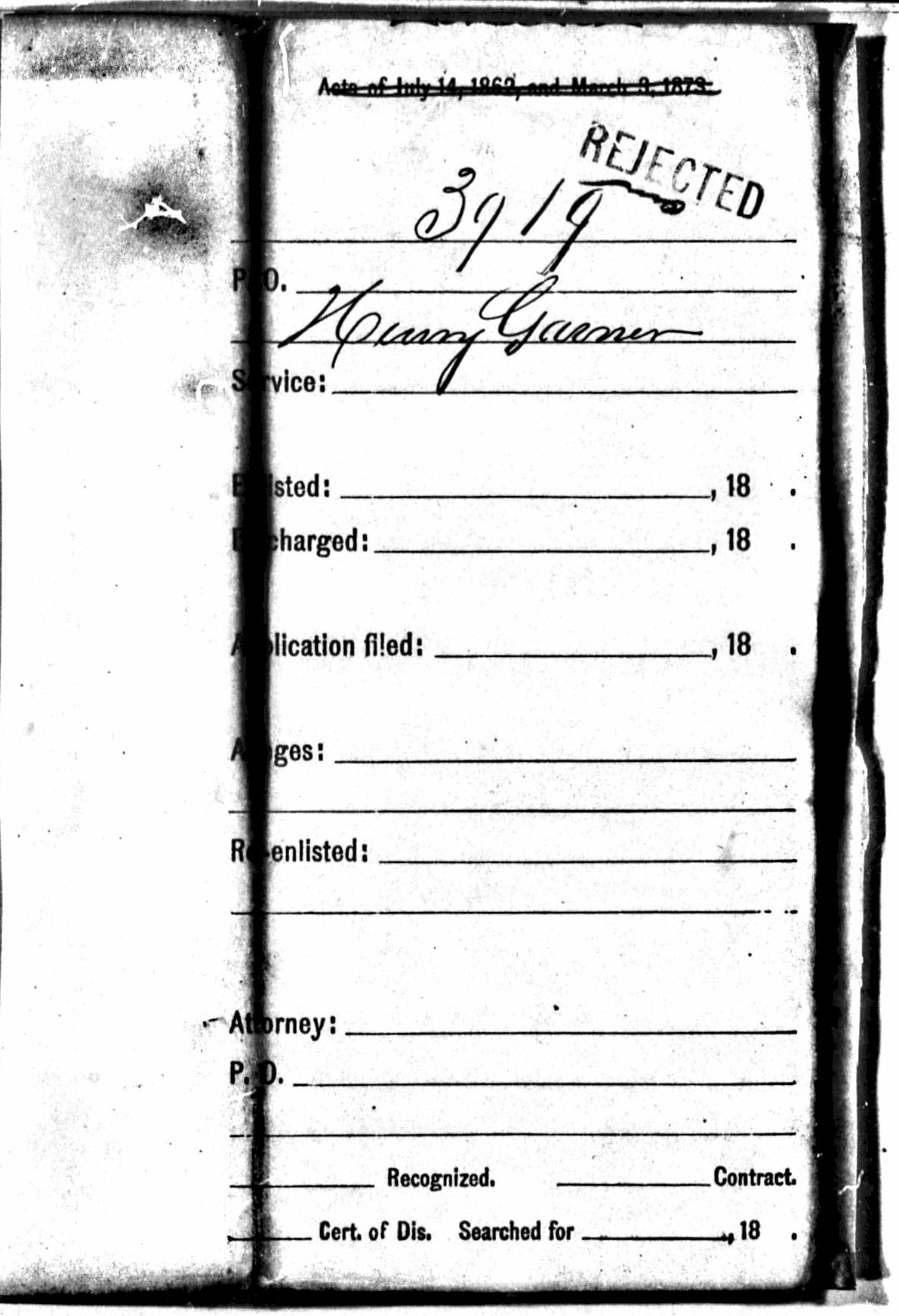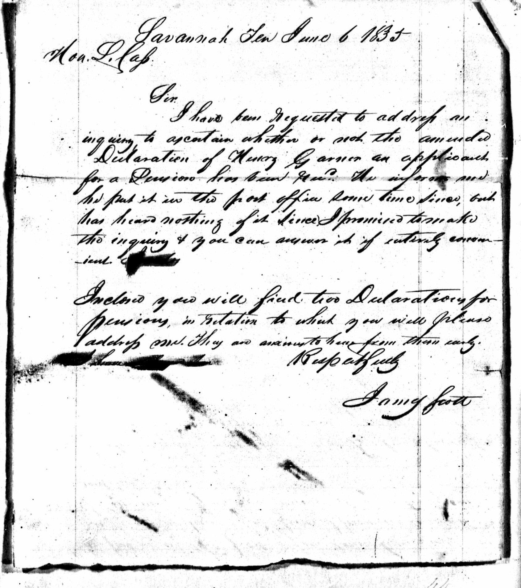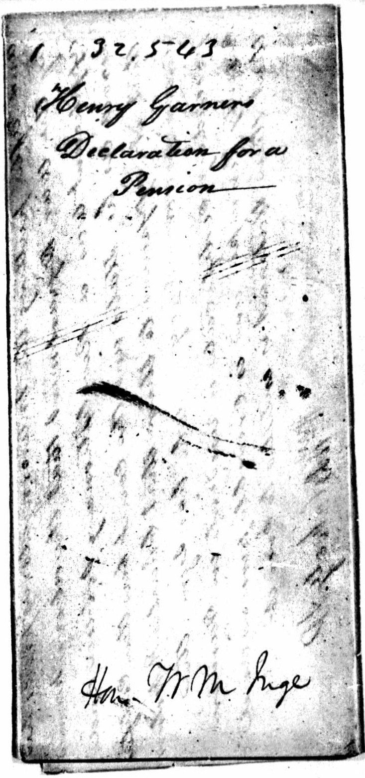 I have been requested to address an inquiry to ascertain whether or not the amended declaration of Henry Garner an applicant for a pension has been rec’d. He infor rec’d he put it sin the post office some time since but has heard nothing of it since . I promised to make the inquiry & you can answer it if certainly erroriant.