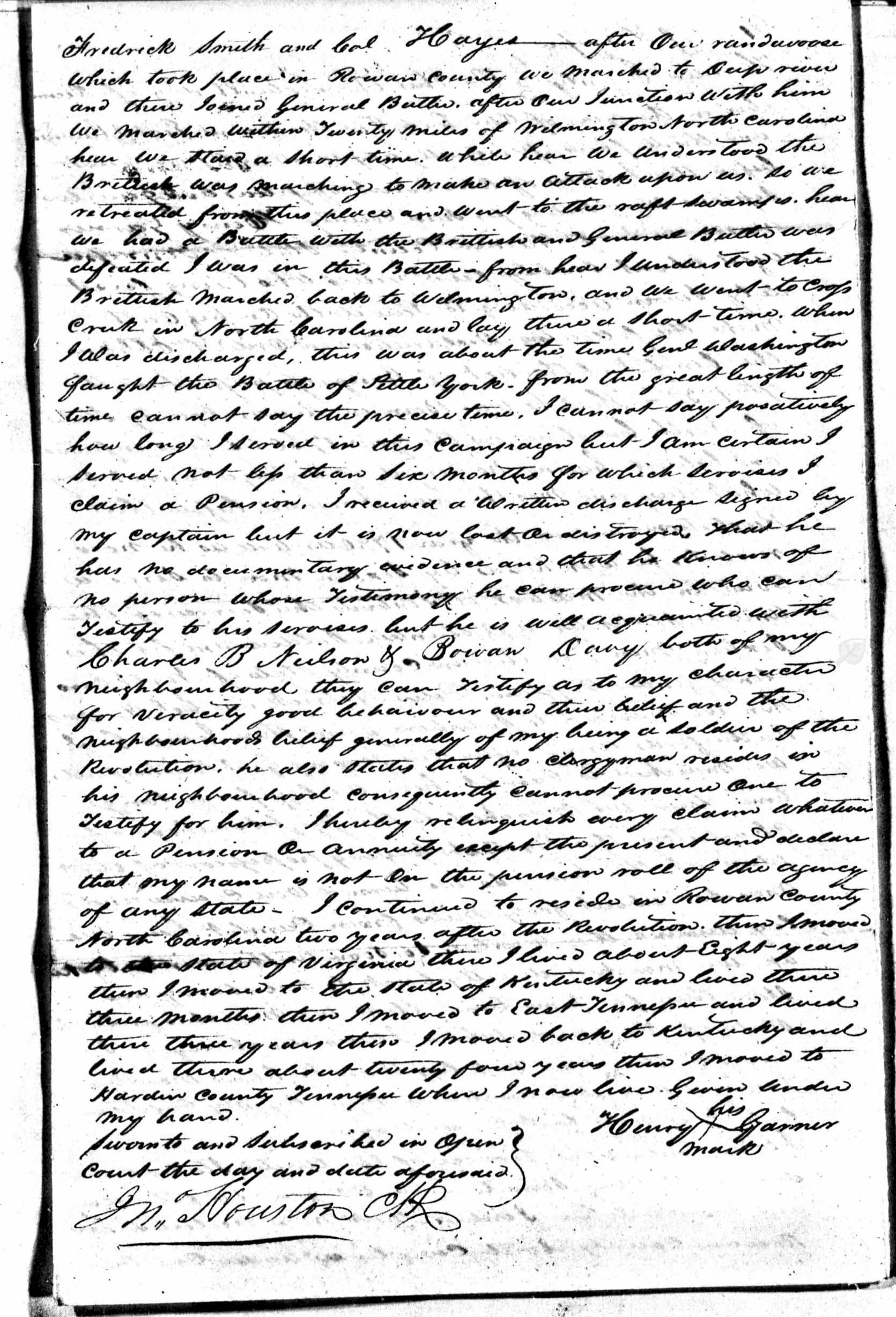 I again entered the service of the United States as a drafted soldier some time in the year 1780 the day and month when I entered not now recollected in Rowan County North Carolina under Captain Frederick Smith and Col. Hayes after our rendezvous which took place in Rowan County we marched to Deep river and there joined General Butler (or Butlis) after our junction with him we marched a within twenty miles of Wilmington North Carolina hear we staid a short time while hear we understood the British was marching to make an attack upon us. So we retreated from this battle & from hear I understood the British marched back to Wilmington and we went to Cross Creek in North Carolina and lay there a short time where I was alas discharged, this was about the time Genl. Washington fought the Battle of Little York from the great length of time can not say the precise time. I cannot say positively how long I served in this campaign but I am certain I served net less than six months for which services I claim a pension. I received a written discharge signed by my captain but it is now lost or destroyed. That he has no documentary evidence and that he knows of no person whose testimony he can procure who can testify to his services but he is well acquainted with Charles B. Neilson & Bowan Davy both of my neighborhood they can testify as to my character for veracity good behavior and their belief and the neighborhood belief generally of my being a soldier of the Revoution. He also states that no clergyman resides in his neighborhood consequently can not procure one to testify for him. I hereby relinquish every claim whatsoever to a pension or annuity accept the present and declare that my name is not on the pension roll of the agency of any state. I continued to reside in Rowan County North Carolina two year after the Revolution and then I moved to the state of Virginia there I lived about eight years then I moved to the state of Kentucky and lived there three months then I moved to East Tennessee and lived there three years then I moved back to Kentucky and I lived there about twenty four years then I moved to Hardin County, Tennessee where I now lives. Given under my hand. Henry (his mark) Garner