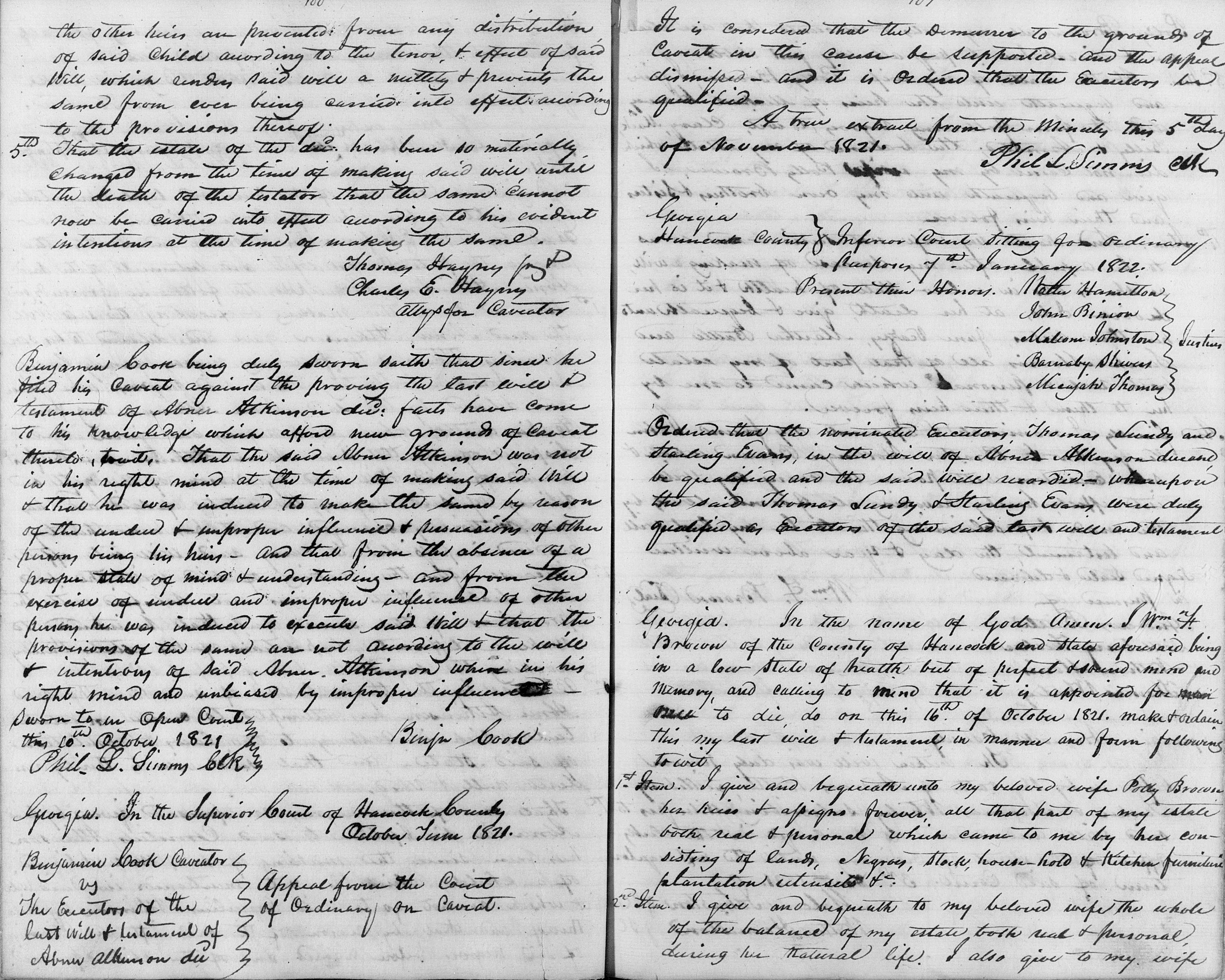 And now at this turn came Thomas Lundy and Sterling Evans nominated executors in the last will and testament of Abner Atkinson dec having proved the said will in vacation and present the same for record and themselves to be qualified upon which Benjamin cook in right of his wife presented his caveat by his attornies to the recording of the same and the qualification of said Executors whereupon the court having considered said caveat and the arguments of counsel, thereupon do _____ the grounds taken in said caveat insufficient & ordered said will to be recorded and said executors to be qualified.