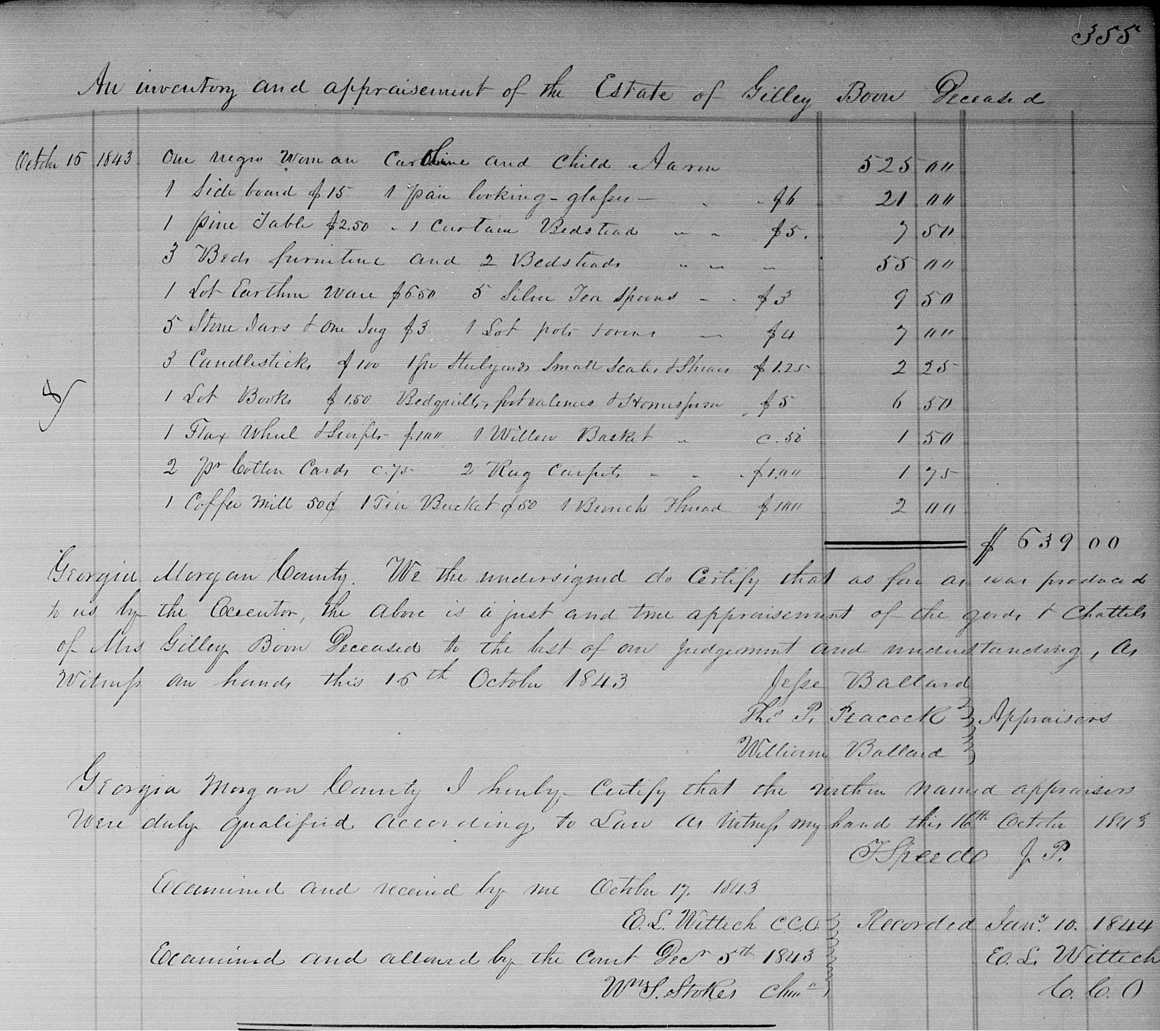 Georgia Morgan County We the undersigned do certify that as far as was produced to us by the Executor the above is a just and true appraisement of the goods & chattels of Mrs. Gilley Boon Deceased to the best of our judgment and understanding, as witness our hands this 16th October 1843
