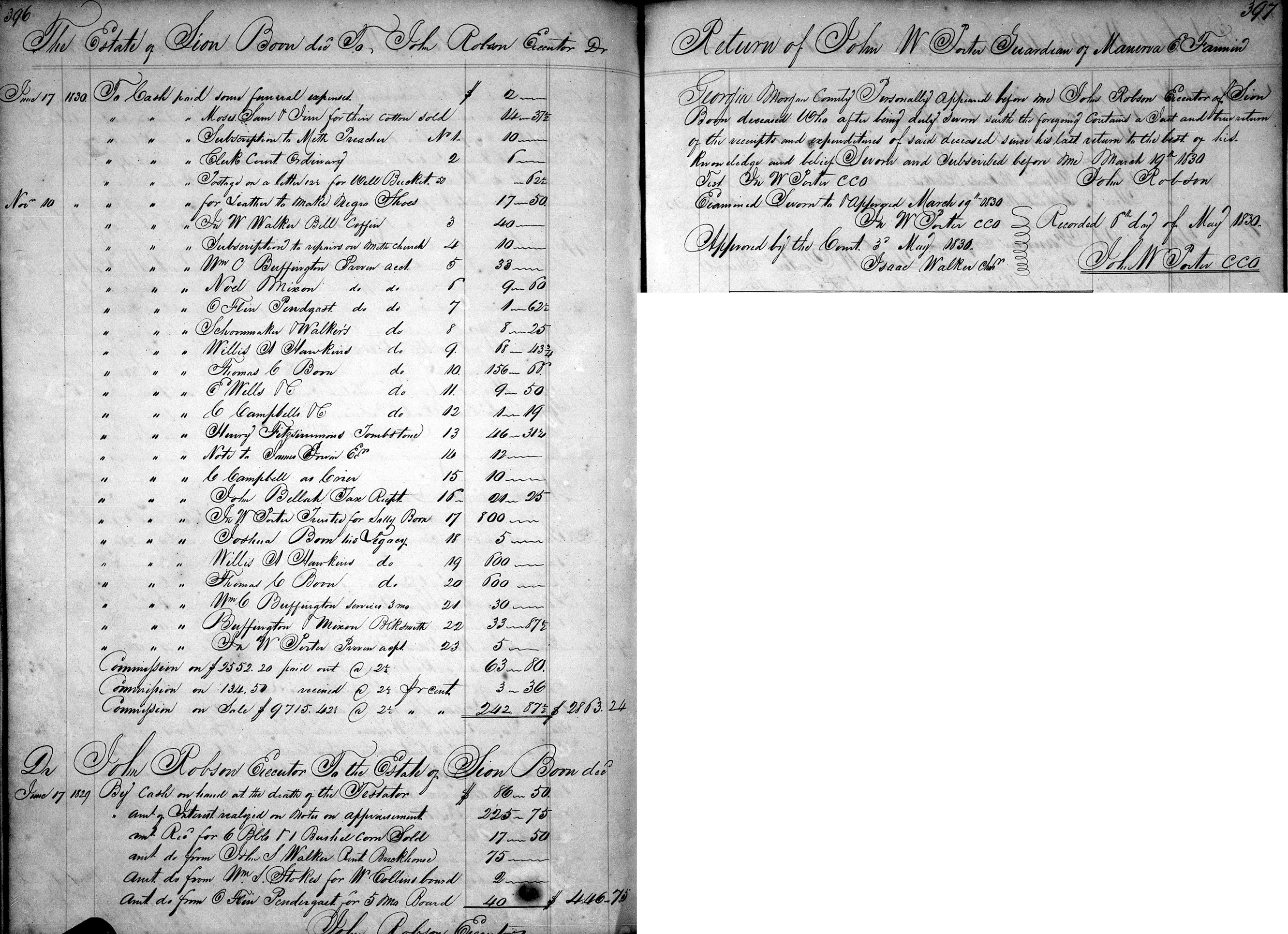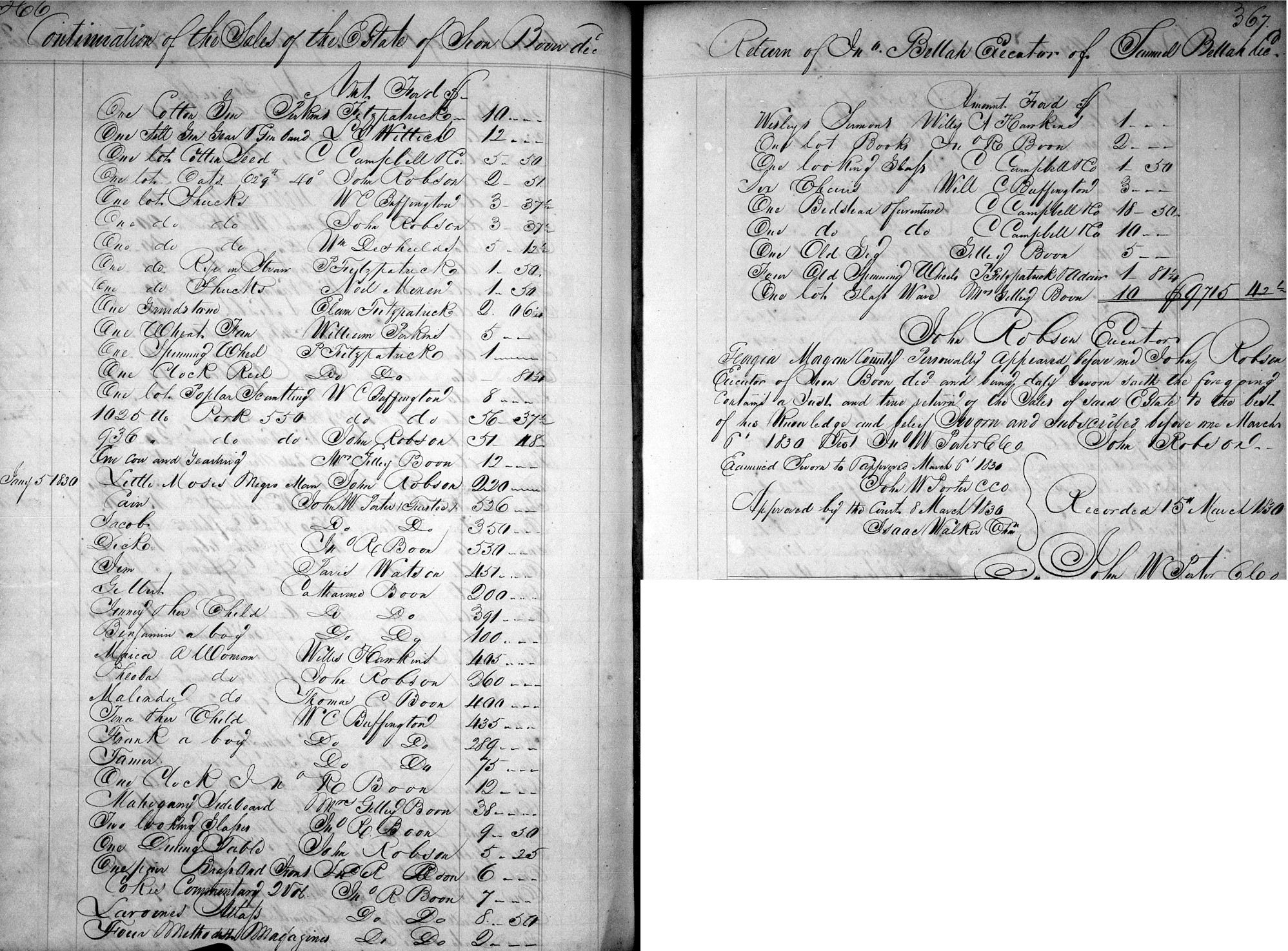 Georgia Morgan county Personally appeared before me John Robson Executor of Sion Boon deceased who after being duly sworn saith the foregoing contains a Just and true return of the receipts and expenditures of said deceased since his last return to the best of his knowledge and belief Sworn and Subscribed before me March 19th 1830