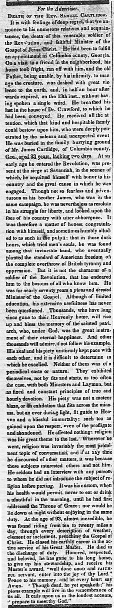 He was buried in the family burying ground of Mr. James Cartlidge, of Columbia county, Geo., aged 93 years lacking two days. At an early age he entered the Revolution, was present at the siege at Savannah, in the scenes of which, he acquitted himself with honor to his country and the great cause in which he was engaged. Though not so fearless and adventurous as his brother James, who was in the same campaign, he was nevertheless as resolute in his struggle for liberty, and looked upon the foes of his country with utter abhorrence. It was therefore a matter of honest congratulations with himself, and sometimes humbly alluded to such in the pulpit; that in those dark hours, which tried men’s souls, he was found among that invincible band, who eventually planted the standard of American freedom on the complete overthrow of British tyranny and oppression. But it is not the character of a soldier of the Revolution, that has endeared him to the bosoms of all who knew him. He was for nearly seventy years a pious and devoted Minister of the Gospel. Although of limited education, his extensive usefulness has never been questioned. Thousands, who have long since gone to their Heavenly home, will rise up and bless the memory of the sainted patriarch, who, under God, was the great instrument of their eternal happiness. And other thousands will admire, if not follow his example. His zeal and his piety uniformly kept pace with each other, and it is difficult to determine in which he excelled. Neither of them was of a periodical caste or nature. They exhibited themselves, not by fits and starts, as too often the case, with both Ministers and Laymen, but as fixed and constant principles of true and hourly devotion. His piety was not a meteor blaze, or an exhalation that flits across the miasma, but an ever during light, fit guide to Heaven and a blissful immortality; such too as gained upon the respect even of the profligate and abandoned. He affected nothing; religion was his great theme to the last. Wherever he went, religion was invariably the most prominent topic of conversation, and if at any time he discoursed of other matters, it was because these subjects interested others and not him. He seldom had an interview with any person, to whom he did not introduce the subject of religion before parting. It was his custom, when his health would permit, never to eat or drink a mouthful in the morning, until he had first addressed the Throne of Grace; nor would he lie down at night without enjoying in the same duty. At the age of 93, almost incredible, he was found riding from ten to twenty miles a day, through every description of weather, element or inclement, preaching the Gospel of Christ. He closed his earthly career in the active service of his Great Master. He died in the discharge of duty. Honored, respected, and beloved, he was gone to his long home, to give up his stewardship, and received his Master’s award, “Well done Good and Faithful servant, enter into the joy of thy Lord.” Peace to his memory, and let every heart say Amen. “Though dead, he yet speaketh;” his pious example will live in the remembrance of us all. It calls upon us in the loudest accents, “prepare to meet thy God.”