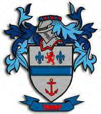 The Shield is: Silver with a red lion surrounded by eight blue fleur de lis The Crest is: A red lion holding a fleur de lis The motto is: Super Antiquas