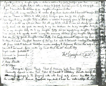 Lastly it is further my will and desire that all my Estate which I have not already give be equally divided into six parts one morely to my son William one to my daughter Polly one to my daughter Sally one to my daughter Gilley and one morely to my daughter Patsy and one morely to be equally divided among the surviving children of my daughter Elizabeth that she had by Josiah Houghton. And Lastly I do herely nominate and appoint my sons William and David Crawford Executors of this my last will and testament heretofore made notifying and confirming this and this only as my last will and testament give under my hand and seal this 30th March 1819.