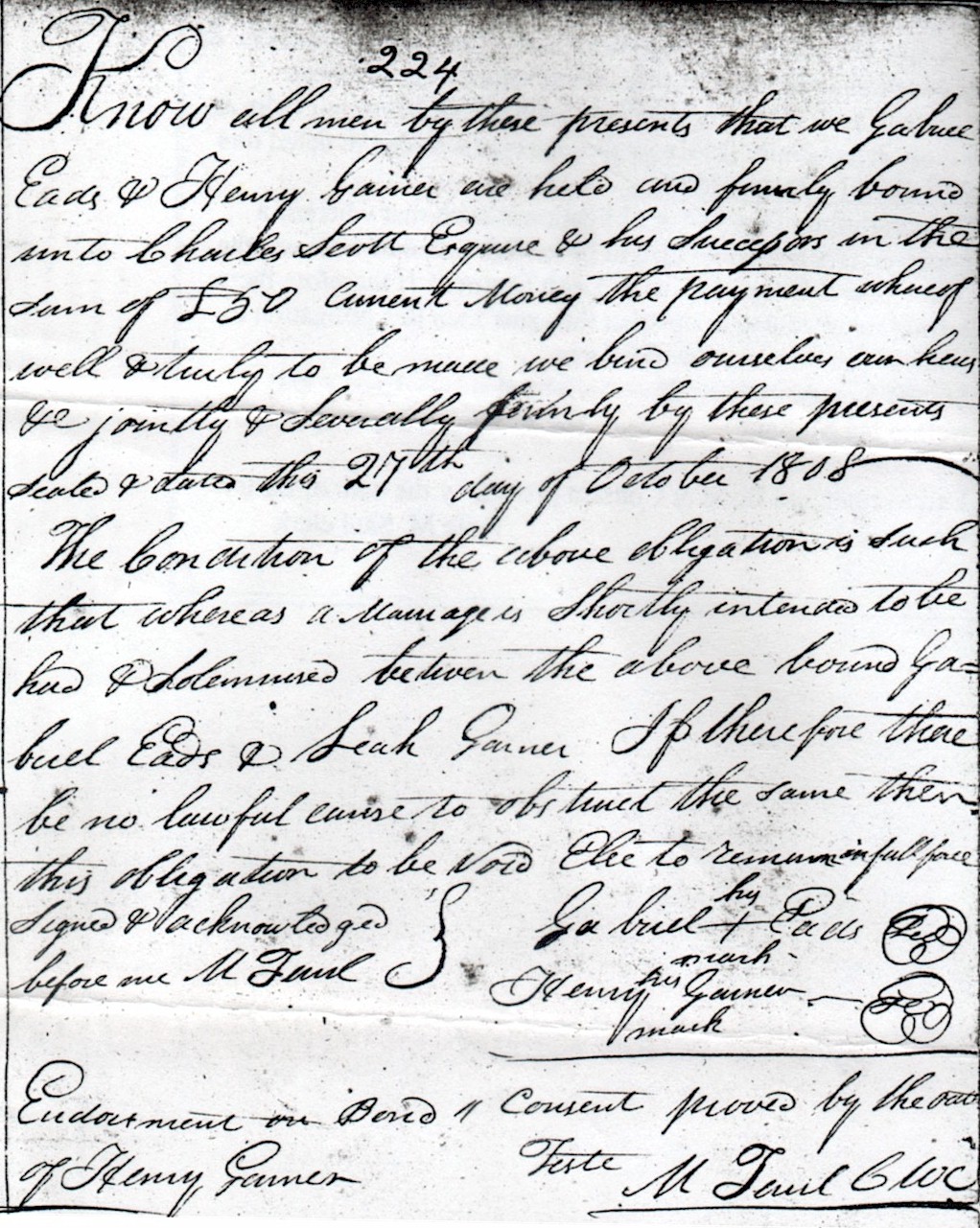Know all men by these presents that we Gabriel Eads & Henry Garner are held and firmly bound unto Charles Scott Esquire & his successors in the sum of £50 current money the payment whereof well & truly to be made we bind ourselves our heirs & jointly & severally firmly by these presents sealed & dated this 27th day of October 1808