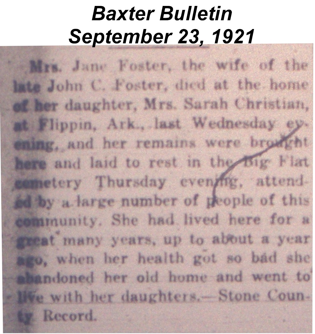 Mrs. Jane Foster, the wife of the late John C. Foster, died at the home of her daughter, Mrs. Sarah Christian, at Flippin, Ark., last Wednesday evening, and her remains were brought here and laid to rest in the Big Flat cemetery Thursday evening, attended by a large number of people of this community. She had lived here for a great many years, up to about a year ago, when her health got so bad she abandoned her old home and went to live with her daughters. - Stone County Record
