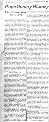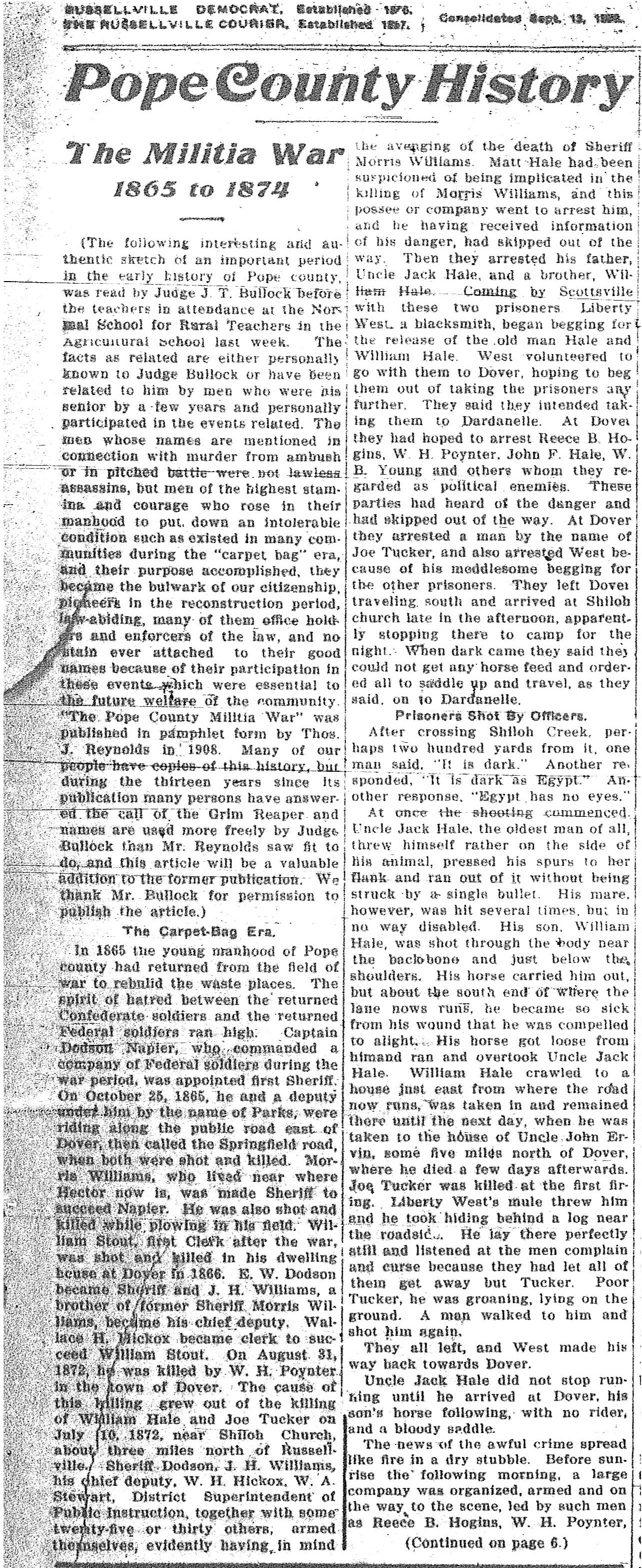 (The following interesting and authentic sketch of an important period in the early history of Pop county, was read by Judge J. T. Bullock before the teachers in attendance at the Normal School for Rural Teachers in the Agricultural school last week. The facts as related are either personally known to Judge Bullock or have been related to him by men who were his senior by a few years and personally participated in the events related. The men whose names are mentioned in connection with murder from ambush or in pitched battle were not lawless assassins, but men of the highest stamina and courage who rose in their manhood to put down an intolerable condition such as existed in many communities during the “carpet bag” era, and their purpose accomplished, they became the bulwark of our citizenship, pioneers in the reconstruction period, law-abiding, many of them office holders and enforcers of the law, and no stain ever attached to their good names because of their participation in these events which were essential to the future welfare of the community. “The Pope County Militia War” was published in pamphlet form by Thos. J. Reynolds in 1908. Many of our people have copies of this history, but during the thirteen years since its publication many persons have answered the call fo the Grim Reaper and names used more freely by Judge Bullock than Mr. Reynolds saw fit to publish the article. )
