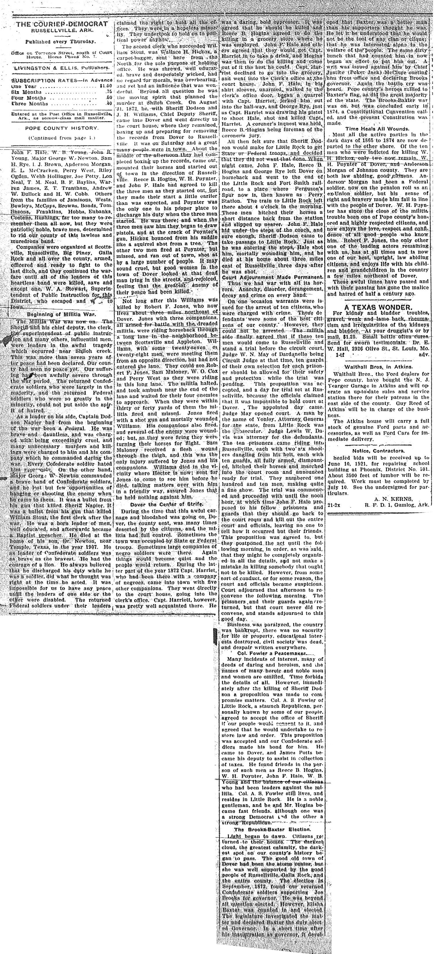 In 1865 the young manhood of Pope county had returned from the field of war to rebuild the waste places. The spirit of hatred between the returned Confederate soldiers and the returned Federal soldiers ran high. Captain Dodson Napier, who commanded a company of Federal soldiers during the war period, was appointed first Sheriff. On October 25, 1865, he and a deputy under him by the name of Parks, were riding along the public road east of Dover then called the Springfield road, when both were shot and killed. Morris Williams, who lived near where Hector now is, was made Sheriff to succeed Napier. He was also shot and killed while plowing in his field. William Stout, first Clerk after the war, was shot and killed in his dwelling house at Dover in 1866. E.W. Dodson became Sheriff and J.H. Williams, a brother of former Sheriff Morris Williams, became his chief deputy. Wallace H. Hickox became clerk to succeed William Stout. On August 31, 1872, he was killed by W.H. Poynter in the town of Dover. The cause of this killing grew out of the killing of William Hale and Joe Tucker on July 10, 1872, near Shiloh Church, about three miles north of Russellville. Sheriff Dodson, J.H. Williams, his chief deputy, W.H. Hickox, W.A. Stewart, District Superintendent of Public instruction, together with some twenty-five or thirty others, armed themselves, evidently having in mind the avenging of the death of Sheriff Morris Williams. Matt Hale had been suspicioned of being implicated in the killing of Morris Williams, and this possee or company went to arrest him, and he having received information of his danger, had skipped out of the way. Then they arrested his father, Uncle Jack Hale, and a brother, William Hale. Coming to Scottsville with these two prisoners Liberty West, a blacksmith, began begging for the release of the old man Hale and William Hale. West volunteered to go with them to Dover, hoping to beg them out of taking the prisoners any further. They said they intended taking them to Dardanelle. At. Dover they had hoped to arrest Reece B. Hogins, W.H. Poynter, John F. Hale, W.B. Young and others whom they regarded as political enemies. These parties had heard of the danger and had skipped out of the way. At Dover they arrested a man by the name of Joe Tucker, and also arrested West because of his meddlesome begging for the other prisoners. They left Dover traveling south and arrived at Shiloh church late in the afternoon, apparently stopping there to camp for the night. When dark came they said they could not get any horse feed and ordered all to saddle up and travel, as they said, on to Dardanelle.