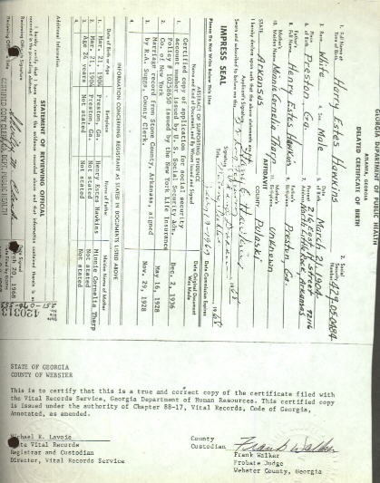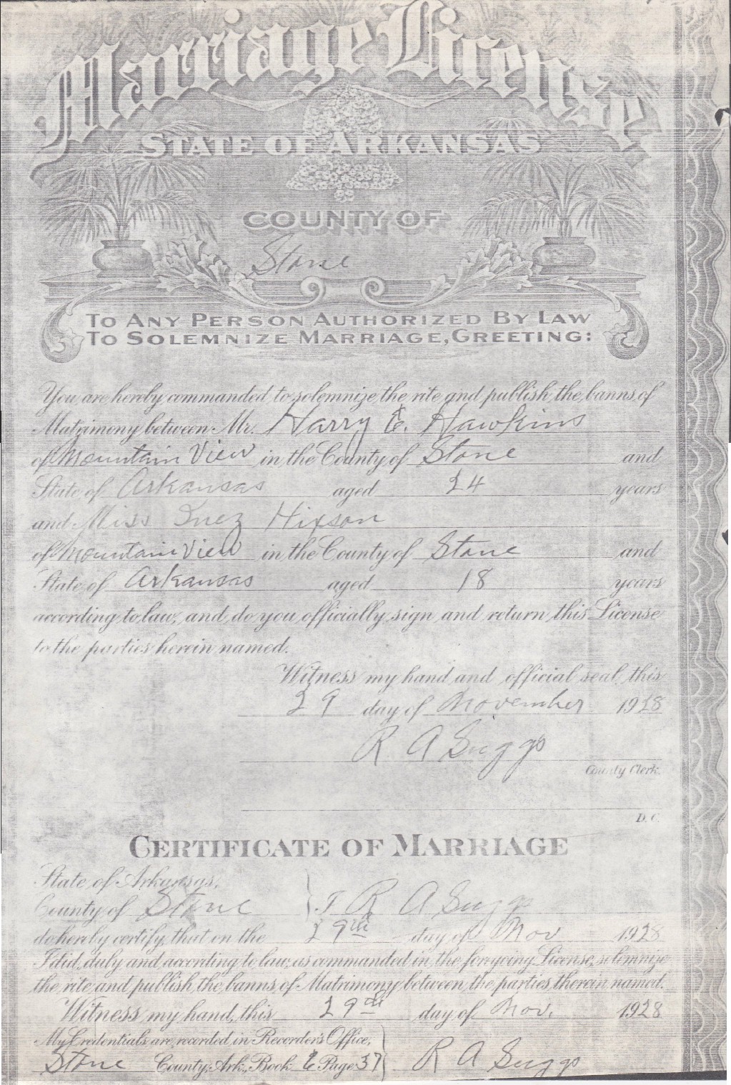Harry and Inez were married at the Stone County, Arkansas courthouse. Note that Inez fudged a bit on her age (but I bet the county clerk knew that as she had lived there all her life). She says she was 18 when she was really only 15 (almost 16).