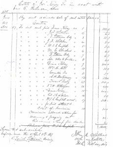 By amt received sale of real estate Contra To amt cash paid Diana Kelsey " " " " J. F. Whitaker " " " " D. Pittman Ordy " " " " J. F. Whitaker " " " " W.T.C. Campbell " " " " M.C. Glanchard " " " " D. Pittman Ordy " " " " Adm notice to Drs. H??? " " " " Diana Kelsey " " " " Wm. H. Hill " " " " Con____ tax " " " " A. H. Montgomery " " " " Towers & Ussery " " " " D. H. Witherspoon " " " " Diana Kelsey " " " " Est. T.C.H. Wilson " " " " W.T.C. Campbell on account " " " " for Final Settlement & Cost of Dismission " commission allowed Adm for recovery & paying out _____ stamp for deed " Balance paid W.T.C. Campbell