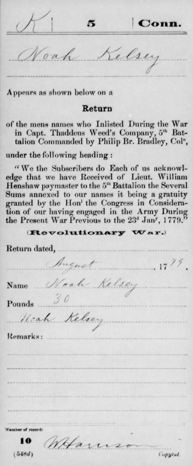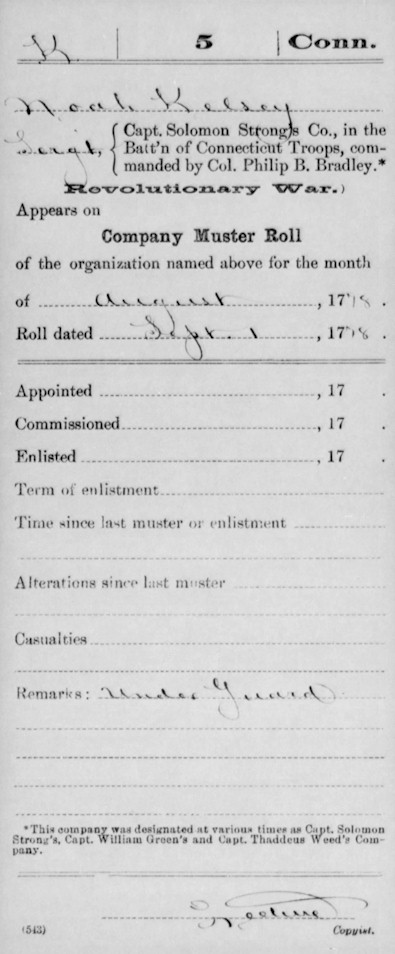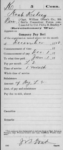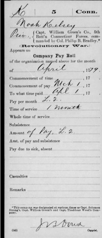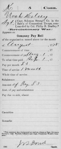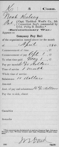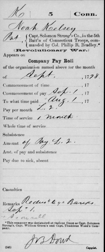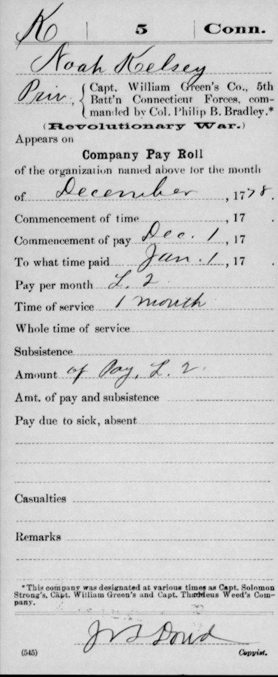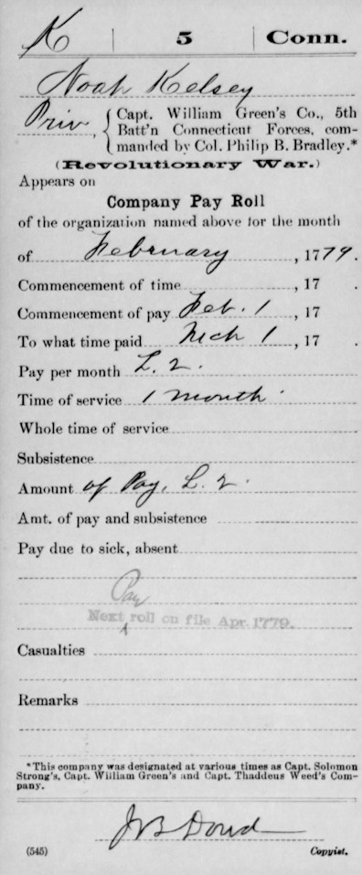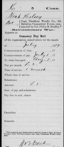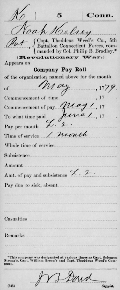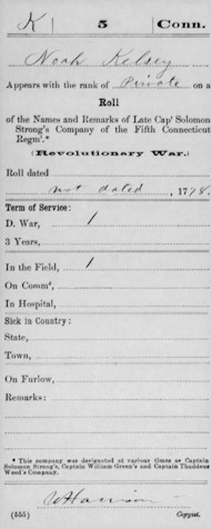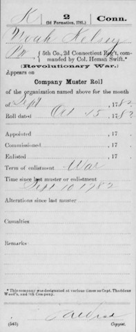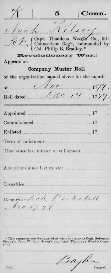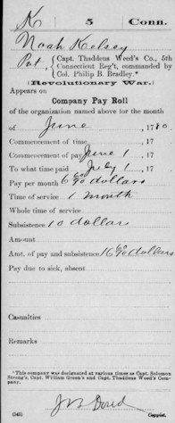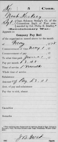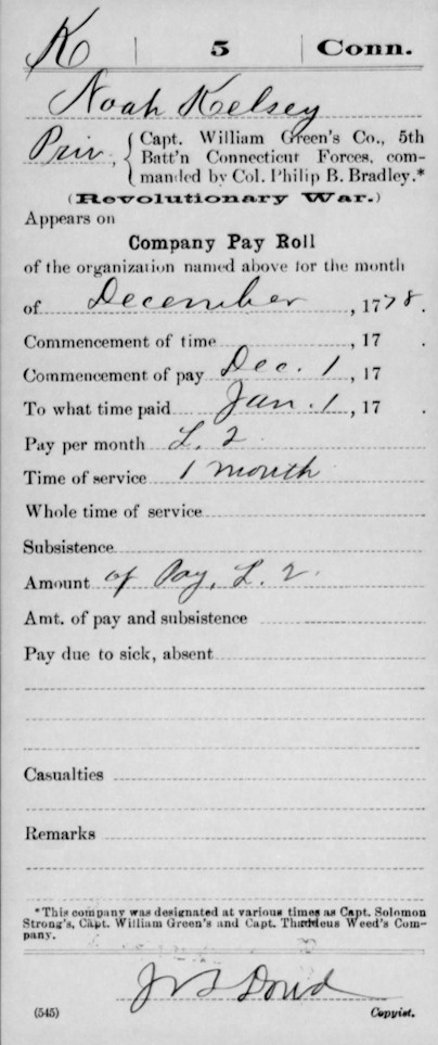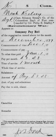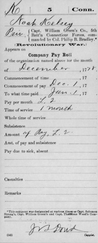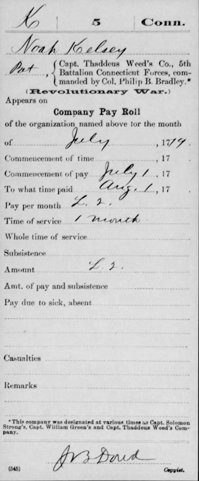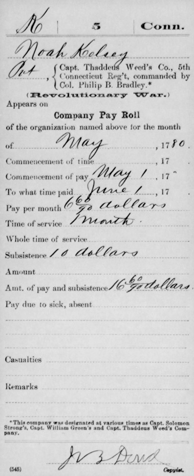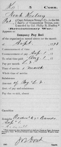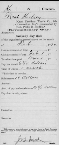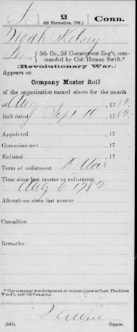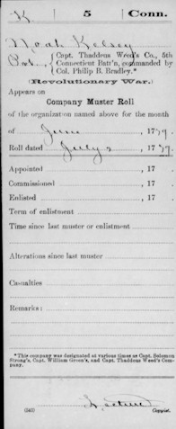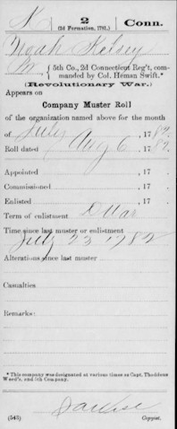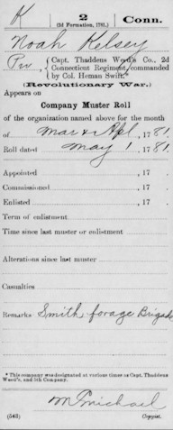Noah Kelsey Revolutionary War Records Company K of the 5th Connecticut Col. Philip B. Bradley's Regiment