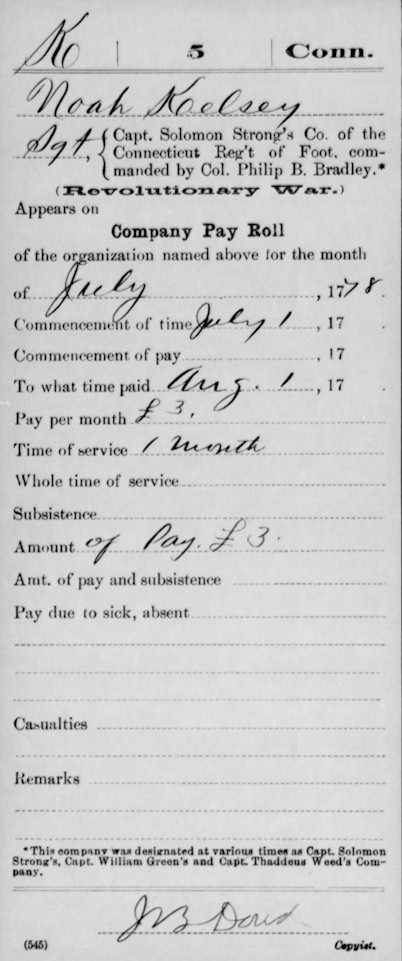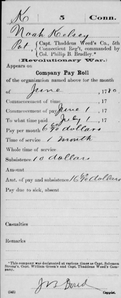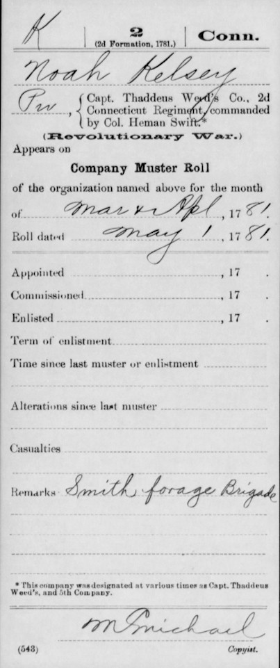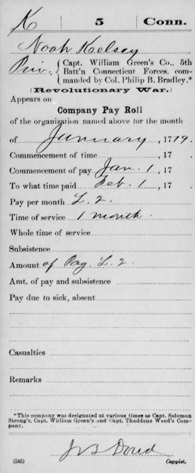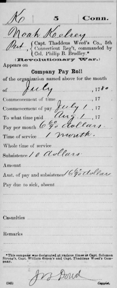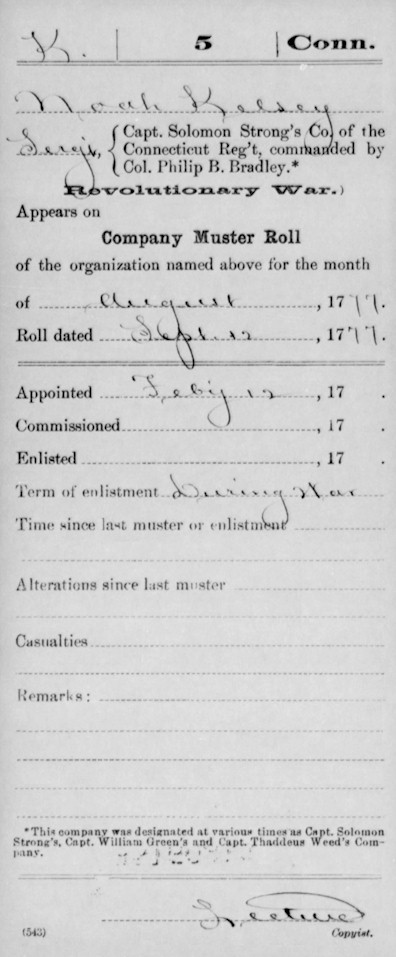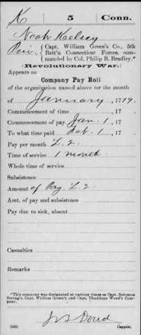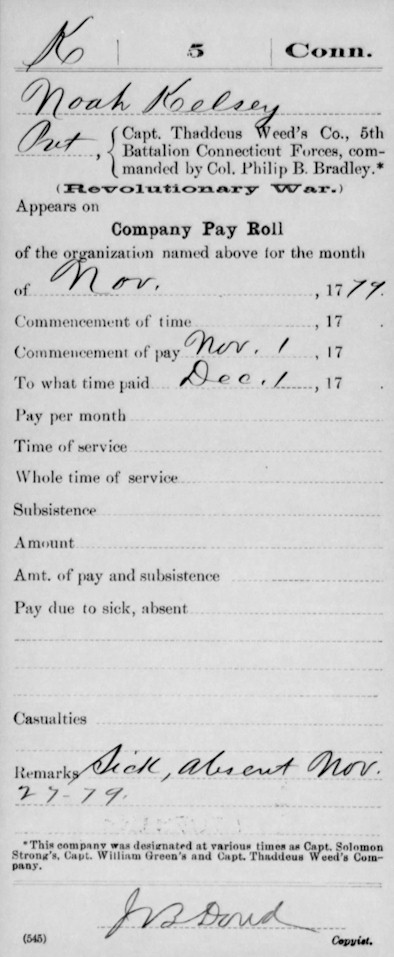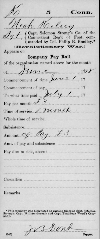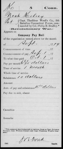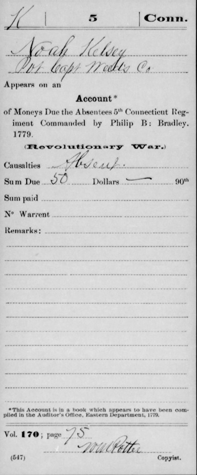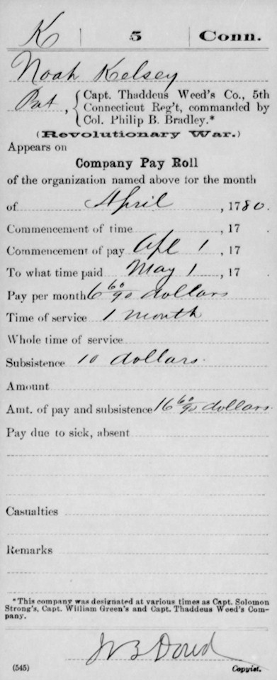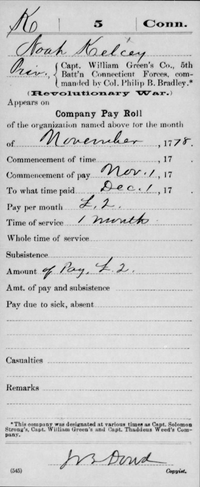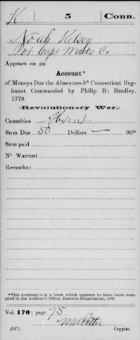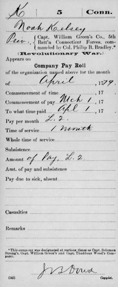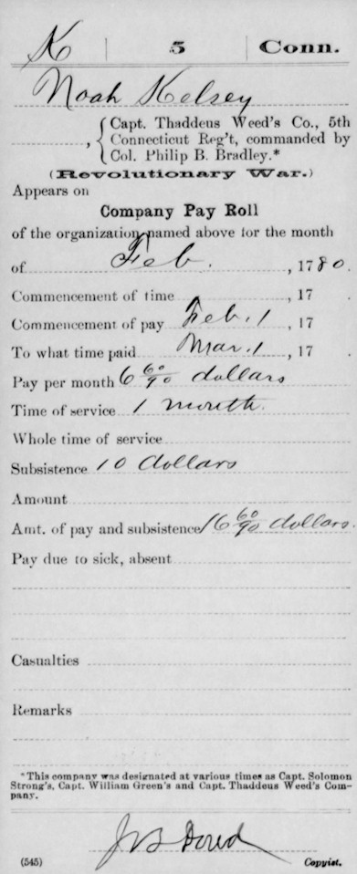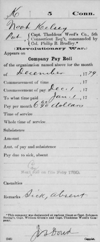 Noah Kelsey Revolutionary War Records Company K of the 5th Connecticut Col. Philip B. Bradley's Regiment