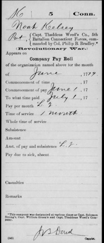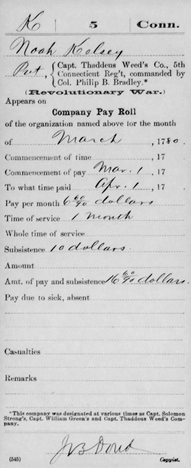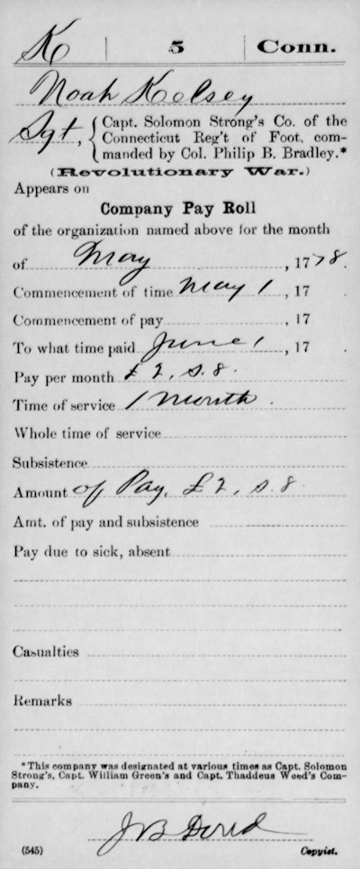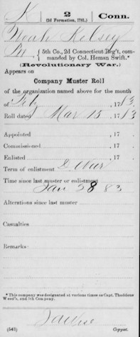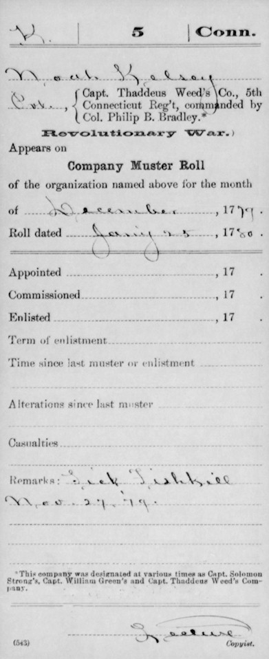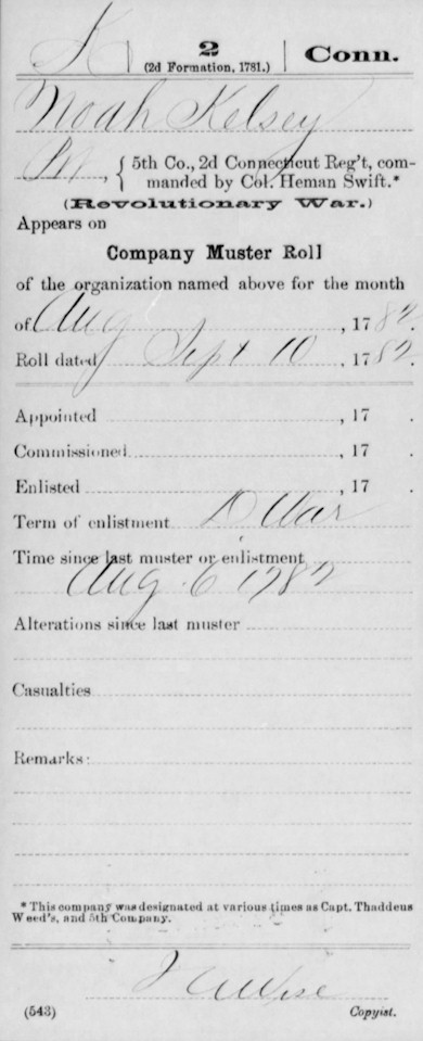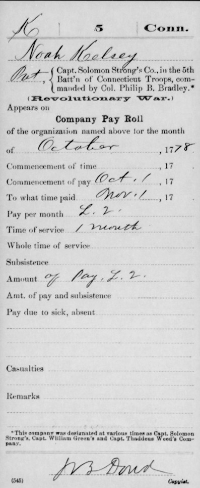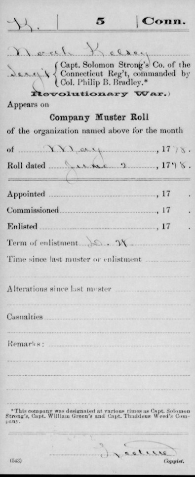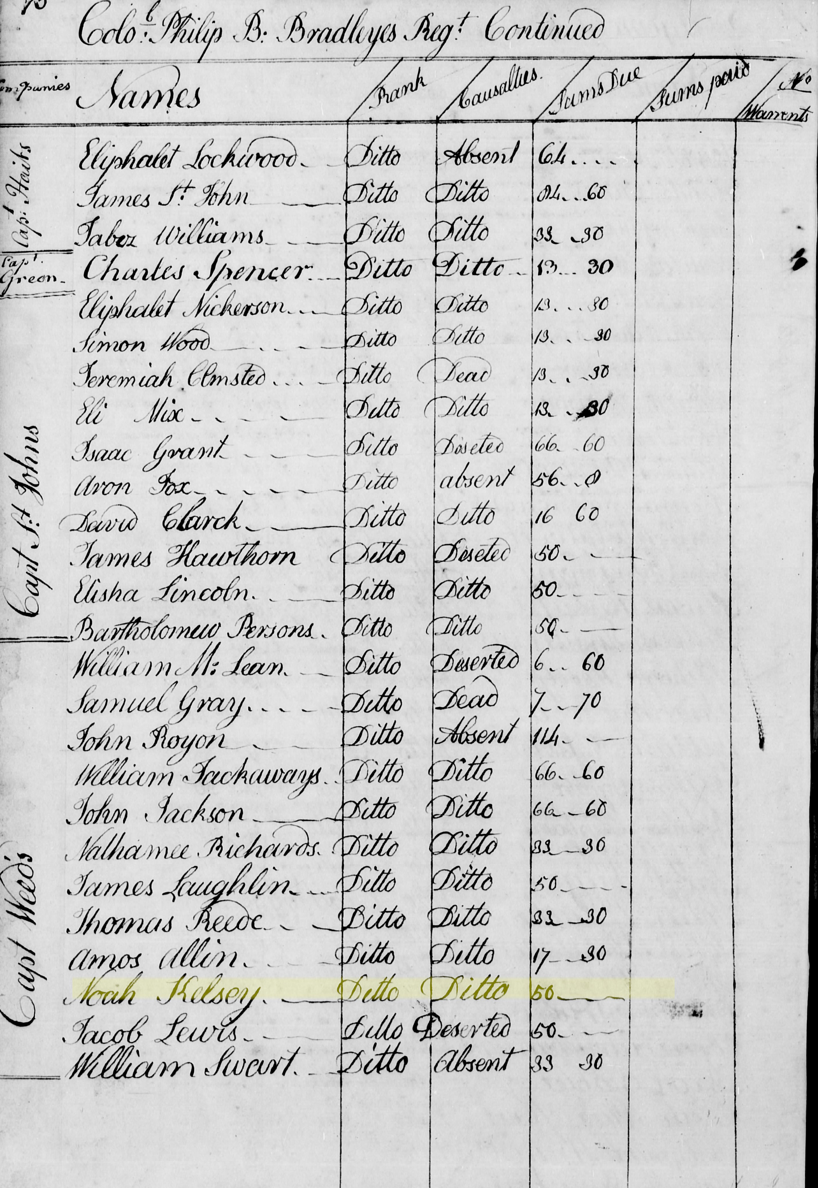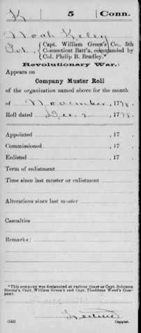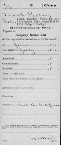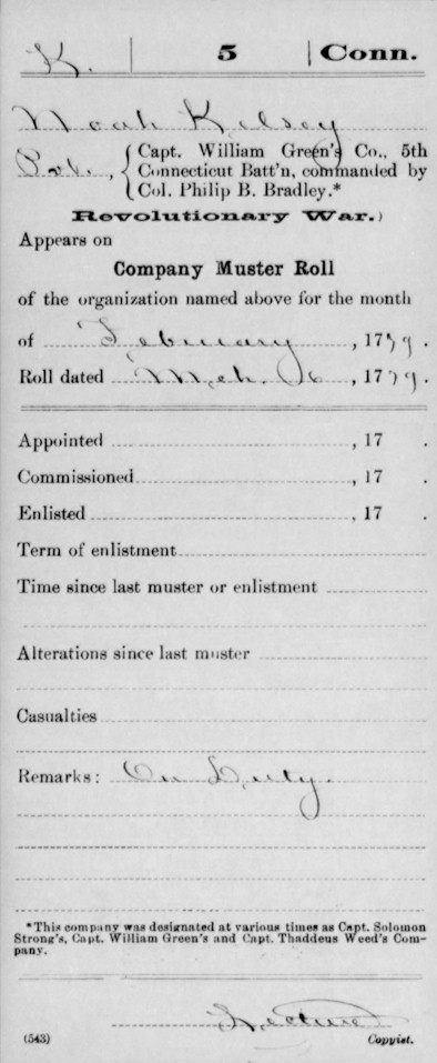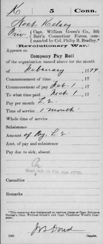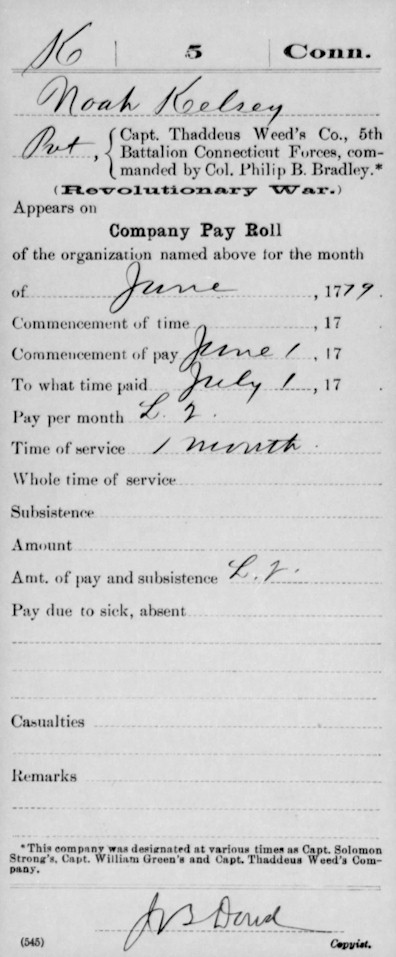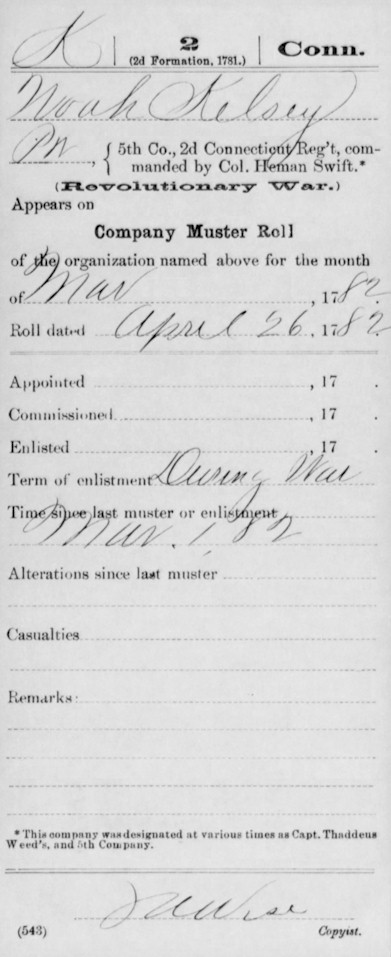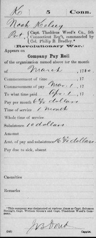 Noah Kelsey Revolutionary War Records Company K of the 5th Connecticut Col. Philip B. Bradley's Regiment