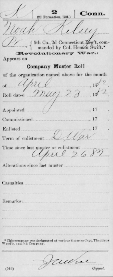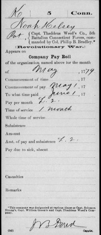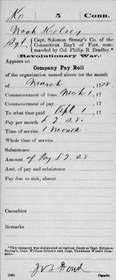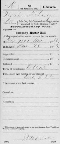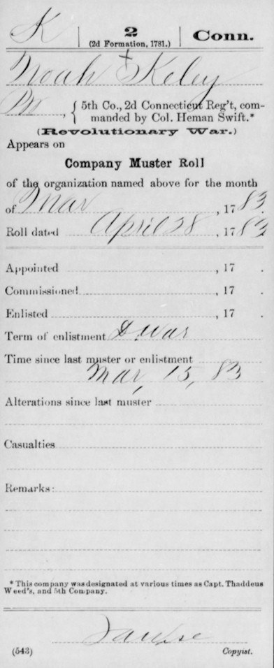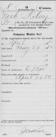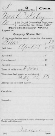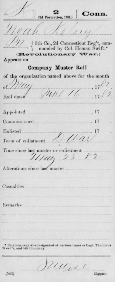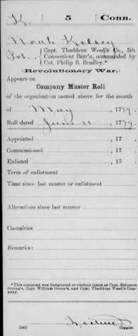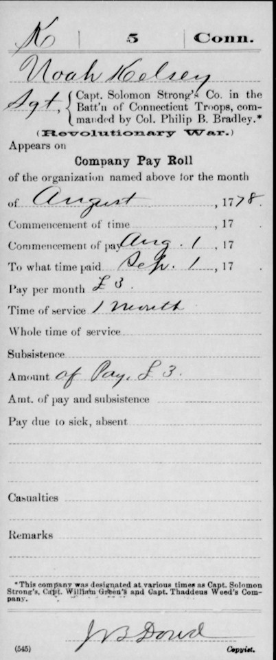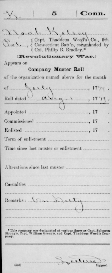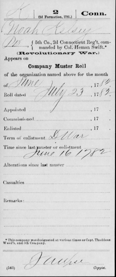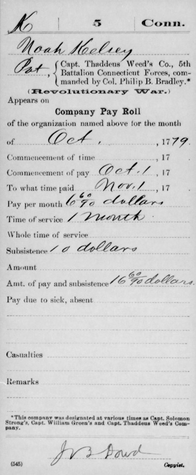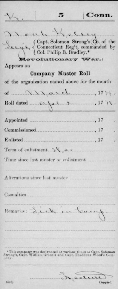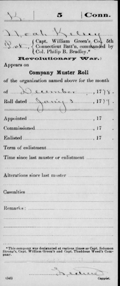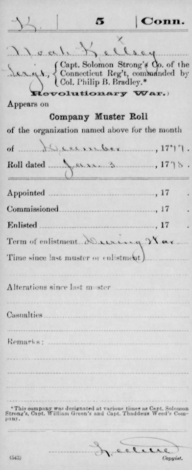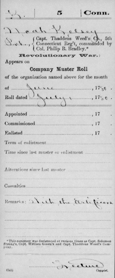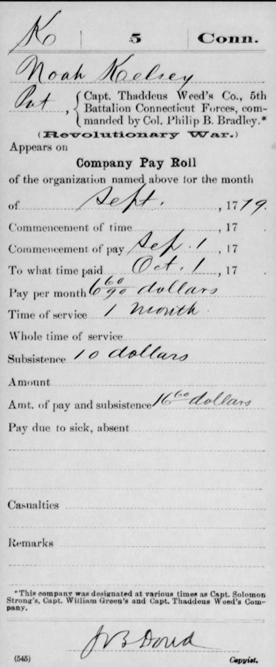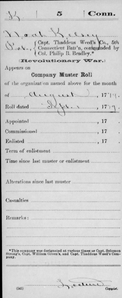 Noah Kelsey Revolutionary War Records Company K of the 5th Connecticut Col. Philip B. Bradley's Regiment