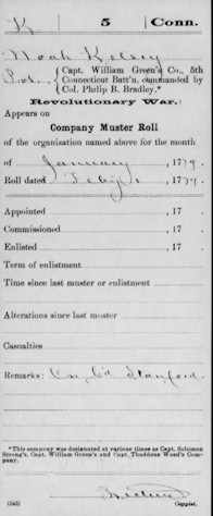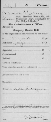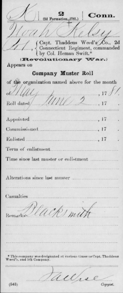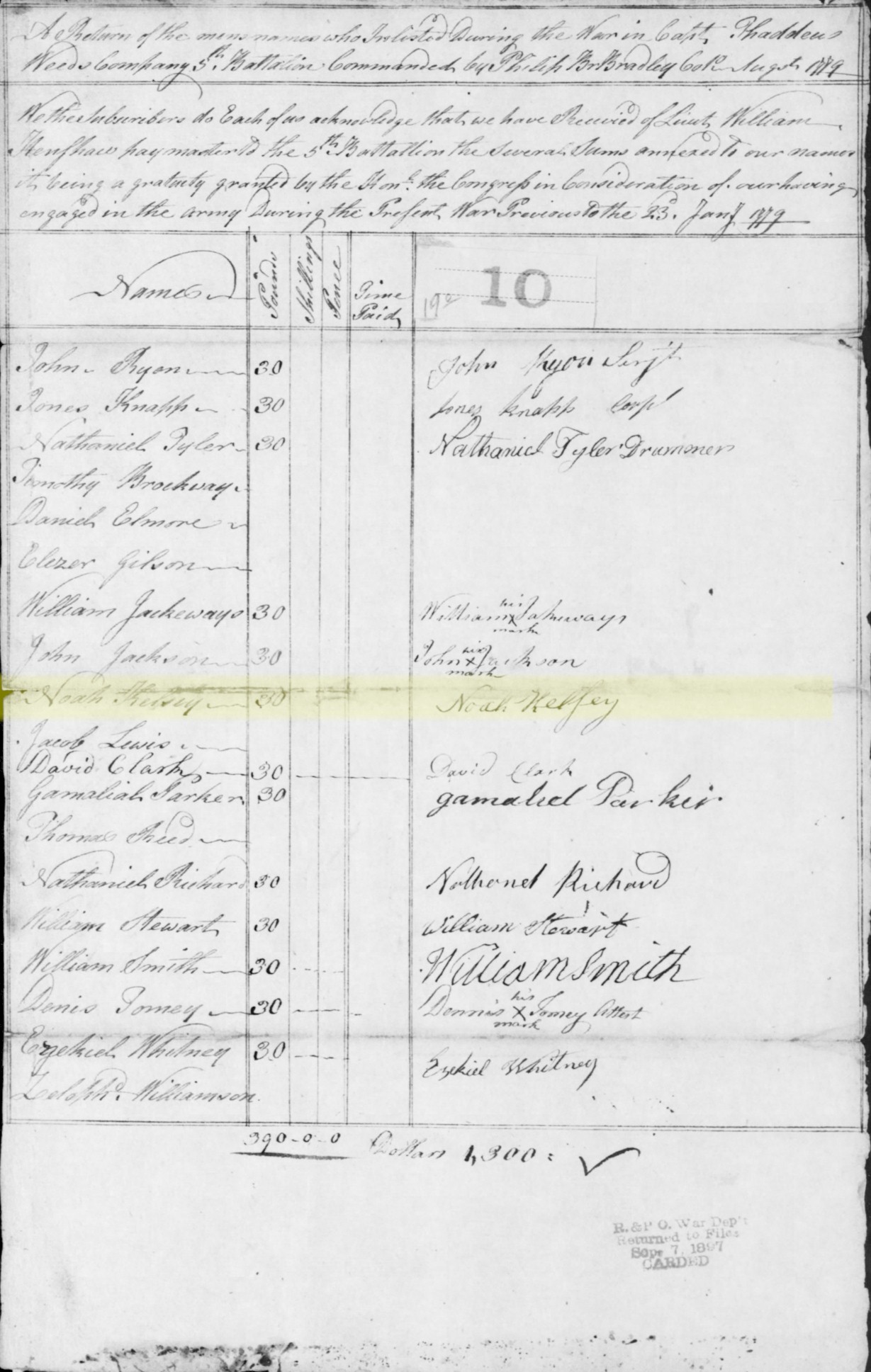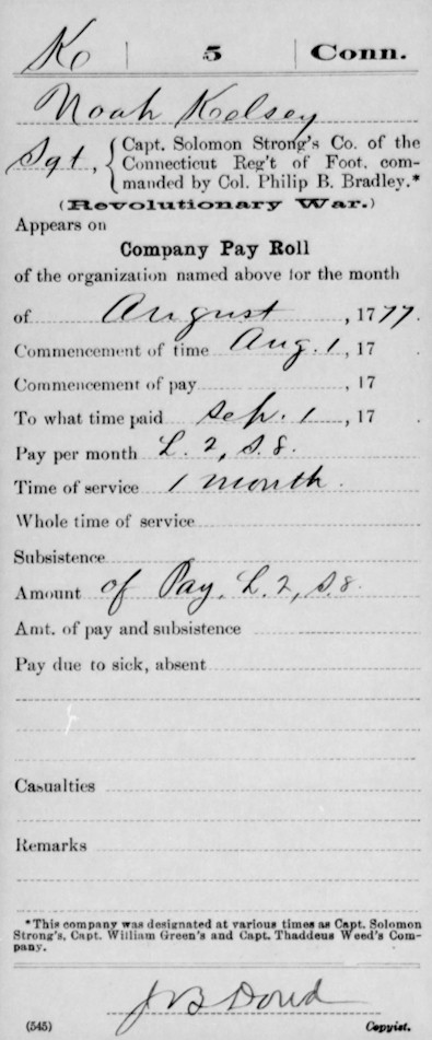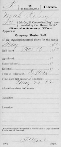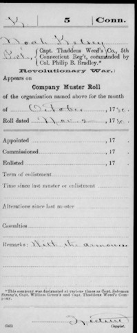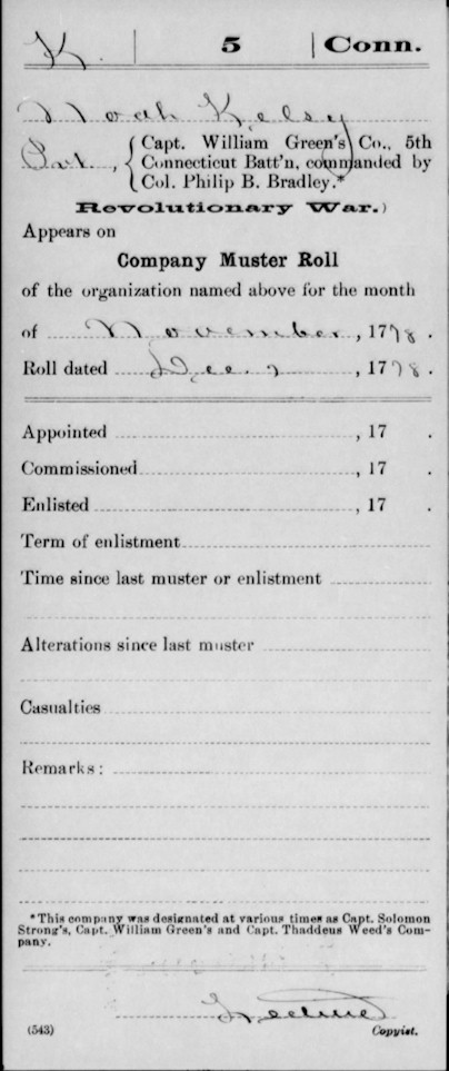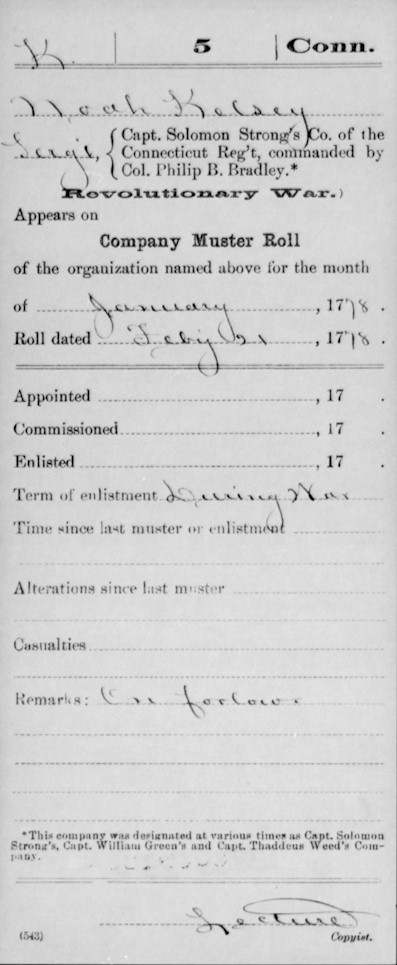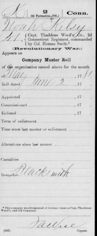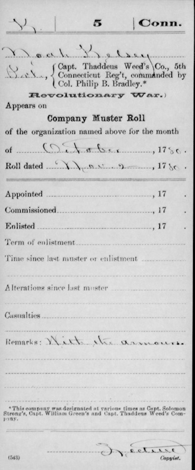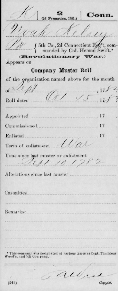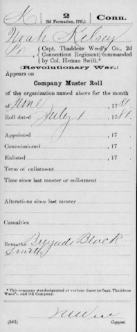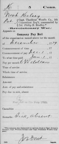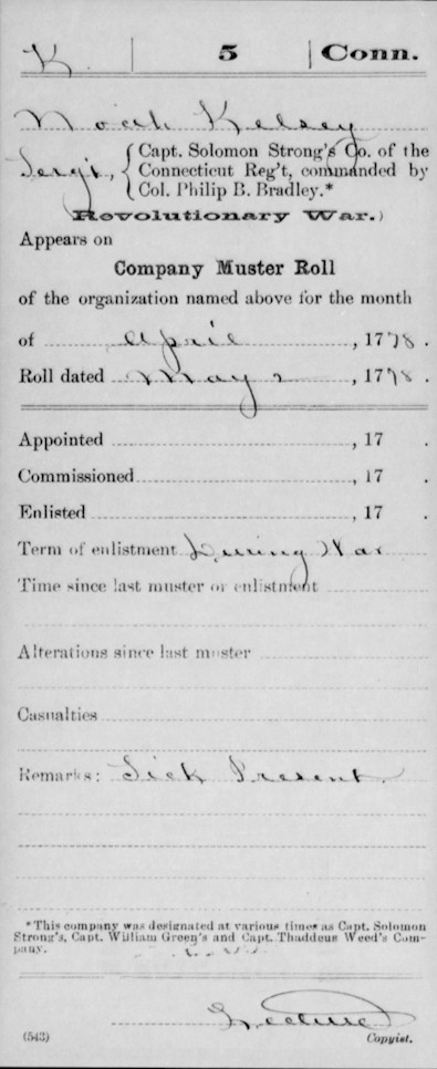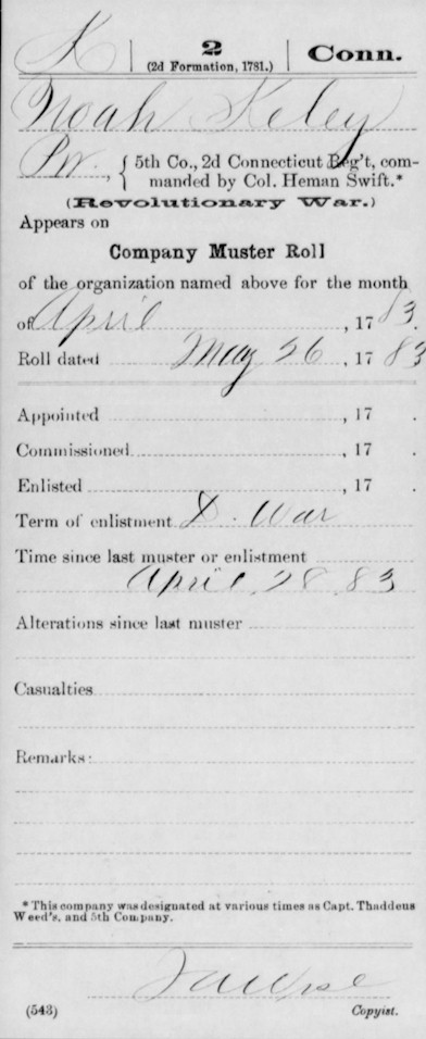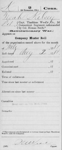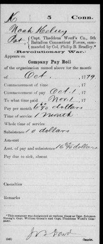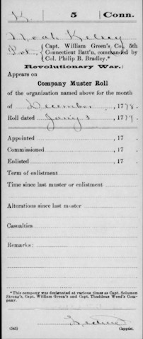 Noah Kelsey Revolutionary War Records Company K of the 5th Connecticut Col. Philip B. Bradley's Regiment