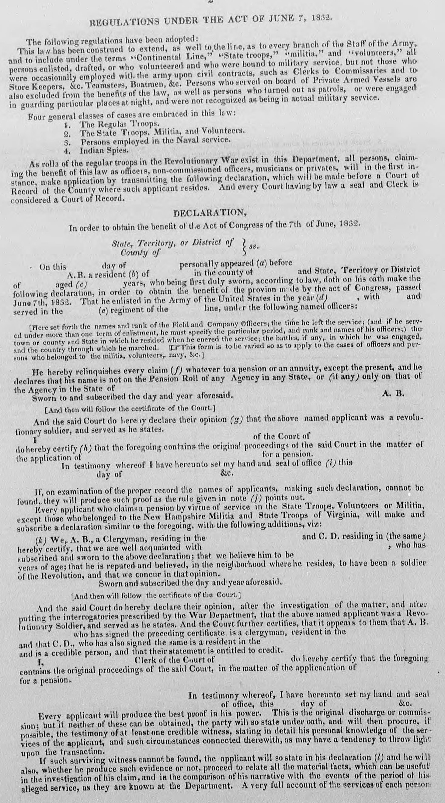 The evidence is support of you claim under the act of June 7, 1832 has been examined, and the papers are herewith returned. The following is a statement of your case in a tabular form. On comparing these papers with the following rules, and the subjoined notes you will readily perceive that objections exist, which must be removed, before a pension can be allowed. The notes and the regulations will show what is necessary to be done. Those points to which your attention is more particularly directed, you will find marked in the margins with a brace ( thus:} ) You will, when you return your paper to this Department, send this printed letter with them; and you will, by complying with this request greatly facilitate the investigation of your claim.