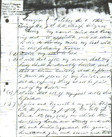 Know All men by these present that we and each of us hath this day mutually agreed that the executors of Rev. C.A. Tharp, late of Twiggs County, Deceased, or either of the said executors proceed immediately, to execute the said will of the said Rev. C.A. Tharp according to the tenor of said will as though it had been properly probated and we and each of us will aid and assist requiring our executors and administrators to do the same; and defend said executor or executors from any or all harm that may hereafter come against them as such executors provided that they proceed no further with such execution than is actually necessary in their judgement to prevent losses or waste of said estate until there can be a regular authorized person in the County of Twiggs to admit wills to probate then said executors to proceed as the Law directs. There being no Ordinary in the aforesaid County, and the Clerk of the Superior Court not being authorized to admit wills to probate, it being necessary to take some action immediately for the benefit of said estate is the reasons whey we have given this article of agreement and caused our hands and seals to be affixed this day of 186