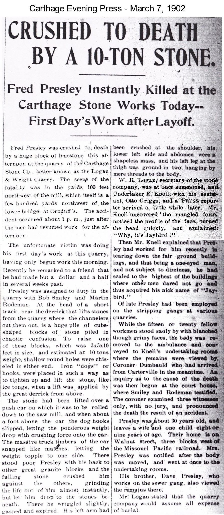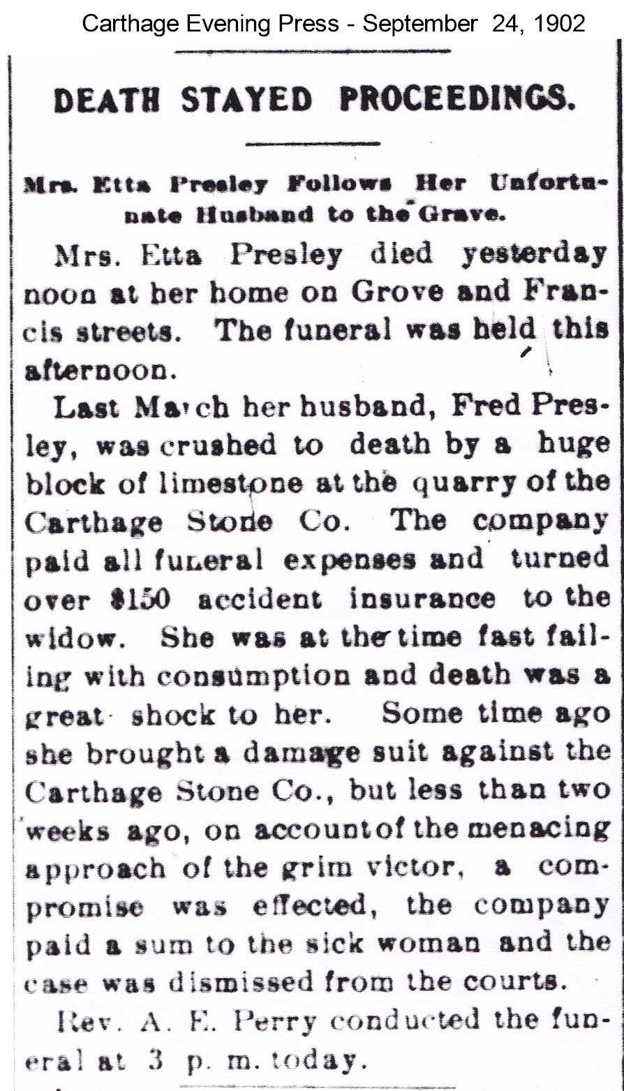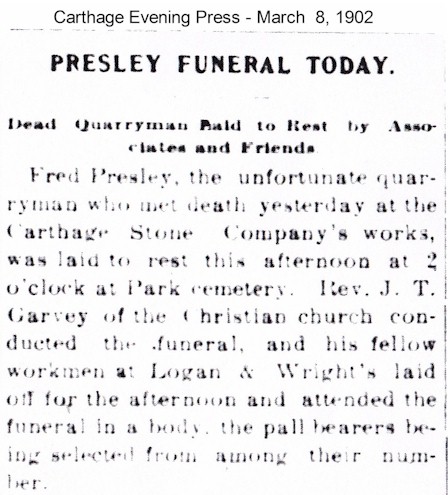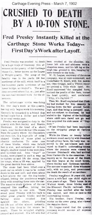 Fred Presley was crushed to death by a huge block of limestone this afternoon at the quarry of the Carthage Stone Co., better known as the Logan & Write quarry. The scene of the fatality was in the yards 100 feet northwest of the mill, which itself is a few hundred yards northwest of the lower bridge at Ornduff’s. The accident occurred about 1 p.m., just after the men had resumed work for the afternoon.