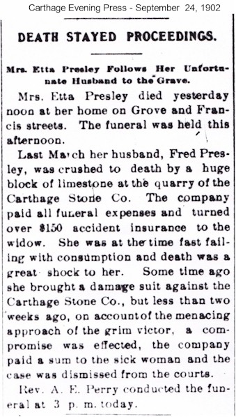 Fred Presley Instantly Killed at the Carthage Stone Works Today – First Day’s Work after Layoff.