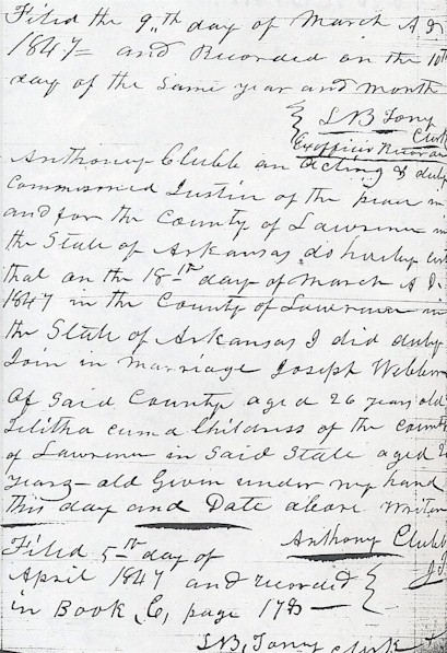I Anthony Clubb an Acting & duly commissioned Justice of the peace in and from the county of Lawrence in the state of Arkansas do hereby enter that on the 18th day of March A.D. 1847 in the county of Lawrence in the state of Arkansas I did duly Join in marriage Joseph Webber of said county aged 26 years old & Telitha Cuma Childress of the county of Lawrence in said state aged 20 years old. Given under my hand This day and date above written