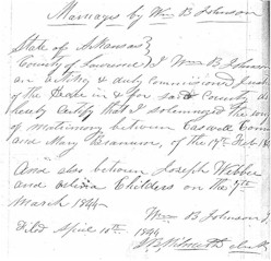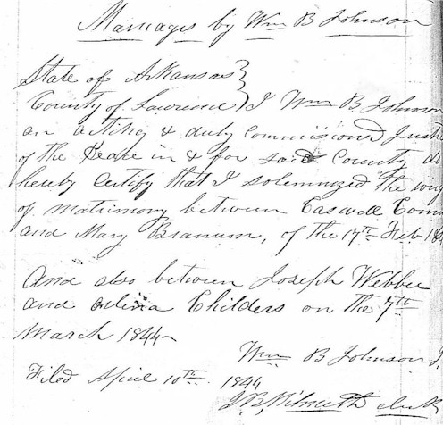 County of Lawrence I Wm B Johnson an acting & duly commissioned Justice of the Peace in & for said county do hereby certify that I solemnzed the way (??) of matrimony between Caswell Corning(??) and Mary Brannson of the 17th Feb 1844
