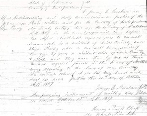 I James E. Gresham in acting and duly commissioned Justice of the Peace within and for the County of Independence do herby certify that on the 11th day of October A.D. 1857 in the county aforesaid came before me Alfred Rockhold aged 53 years to me well known who is a resident of aforesaid county and Eliza Presley also to me well known and of the age 27 years a resident also of aforesaid County & State and they were there by me as their mutual request joined in the bonds of Matrimony according to the laws of our County. In witness whereof I do and my hand and seal as such Justice this 12th day of October A.D. 1857